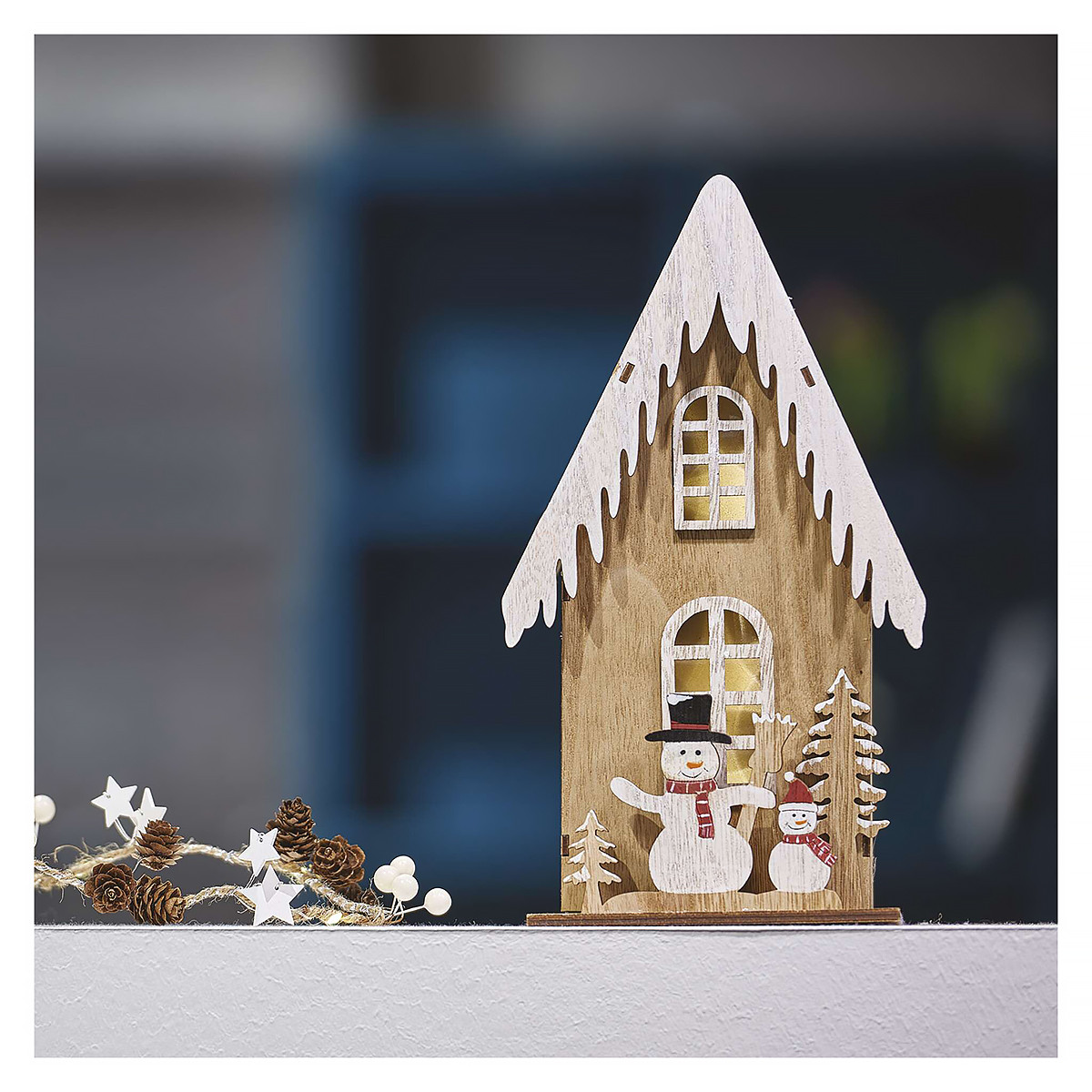 LED dekoráció, fa – házikó hóemberekkel, 28,5 cm, 2x AA, beltéri, meleg fehér, időzítő