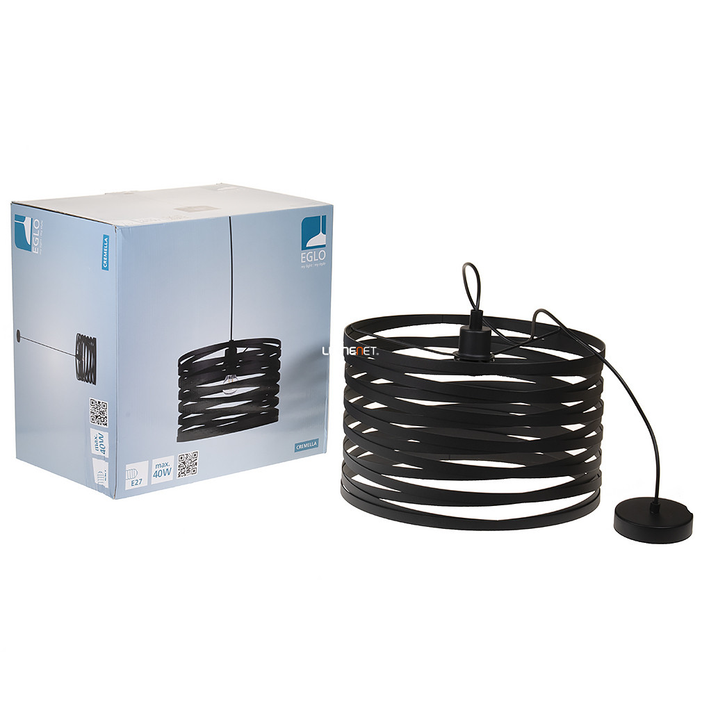 A Cremella Eglo 99345 spirált búrás függesztett lámpa modern stílusú világítási megoldás, mely acélból készült, fekete színben. A lámpatest átmérője 37 cm, magassága 110 cm, tömege 3,1 kg. Egy darab E27 foglalattal rendelkezik, amelybe cserélhető fényforrás helyezhető, a fényforrást a csomag nem tartalmazza. A lámpa nem szabályozható, IP20 védettséggel rendelkezik, így beltéri használatra készült. A termék csomagolásának méretei: 26 cm szélesség, 39 cm hosszúság és 38 cm magasság. A gyártó az EGLO.