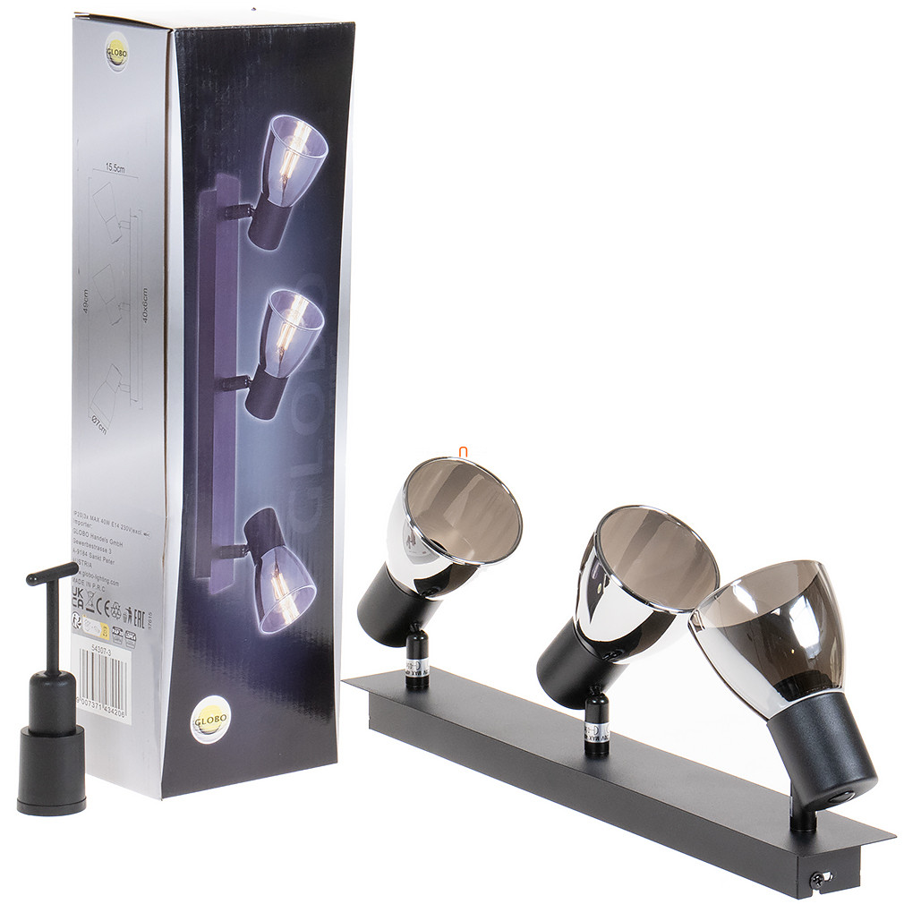 A Claude Globo 54307-3 spot lámpa három E14 foglalattal rendelkezik, lehetővé téve különböző típusú és színhőmérsékletű cserélhető fényforrások alkalmazását. A lámpatest anyaga fém és üveg, felülete matt fekete és füstszínű kivitelben készült. A mennyezeti lámpa IP20-as védettséggel rendelkezik, beltéri használatra alkalmas. Méretei: hossza 400 mm, szélessége 70 mm, magassága 155 mm, tömege pedig 1,05 kg. A termék nem tartalmaz fényforrást, így a fényáram, fényszín és színhőmérséklet a behelyezett izzótól függ. A lámpa logisztikai kódja 54307-3, gyártója a Globo.
