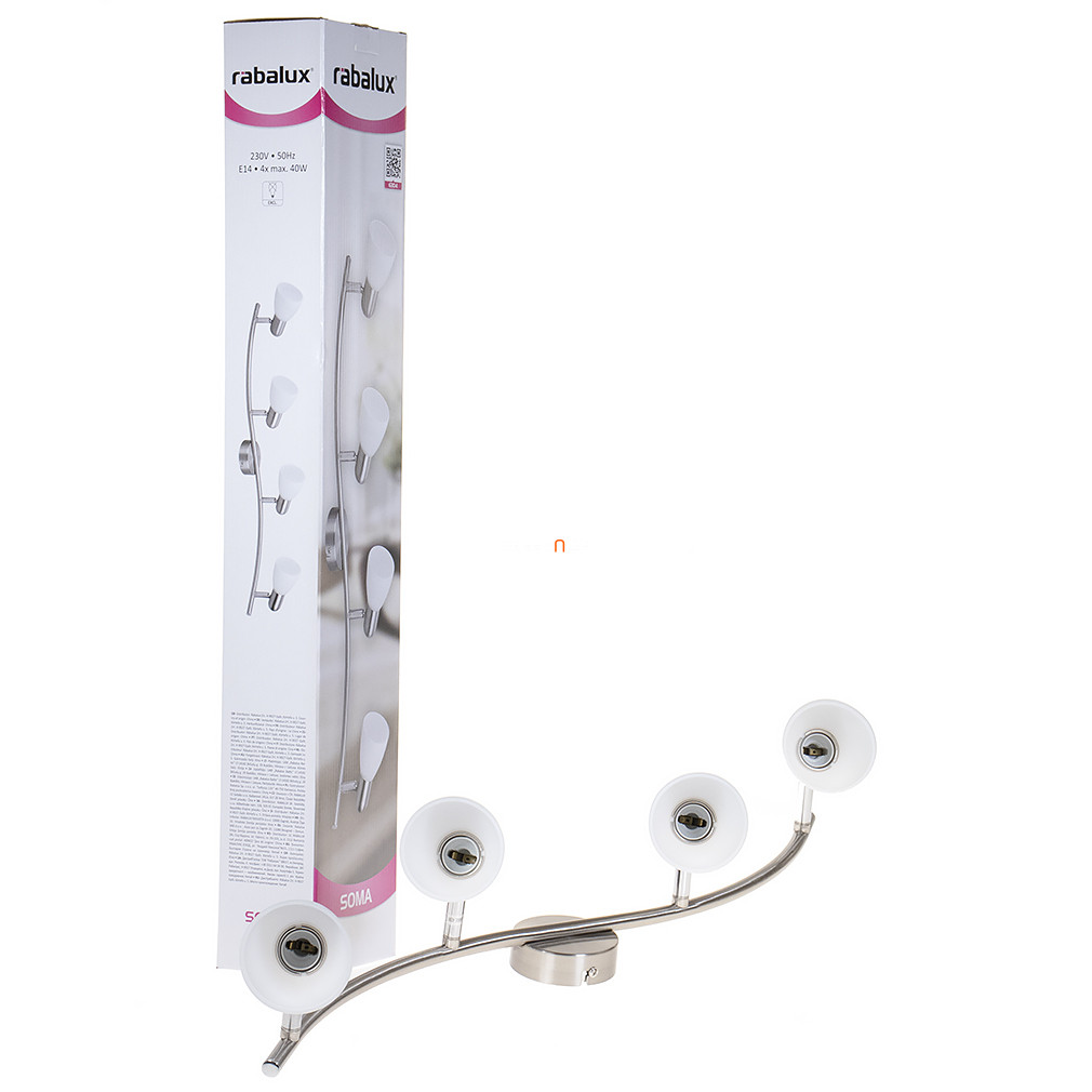 A Soma Rábalux 6304 spot lámpa négy darab E14 foglalattal rendelkezik, amelyek cserélhető fényforrással szerelhetők fel. A mennyezeti lámpatest modern stílusban készült, fő anyaga a fém és az üveg, színe ezüst és opál kombinációja. A lámpa teljes hossza 80 cm, szélessége 70 cm, magassága 16 cm, tömege 1,46 kg. A termék IP20 védettségi besorolással rendelkezik, így beltéri használatra alkalmas. A lámpatest nem tartalmaz fényforrást, a fényáram, fényszín, teljesítmény és színhőmérséklet a választott izzótól függően változik. A lámpa nem szabályozható. A csomagolás méretei: 12 cm szélesség, 8 cm hosszúság, 70 cm magasság. A termék gyártója a Rábalux.