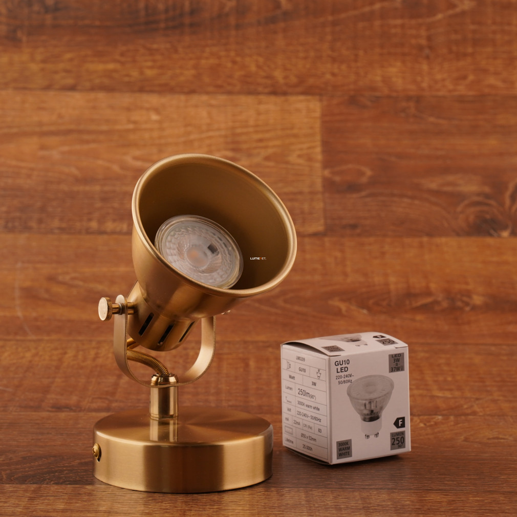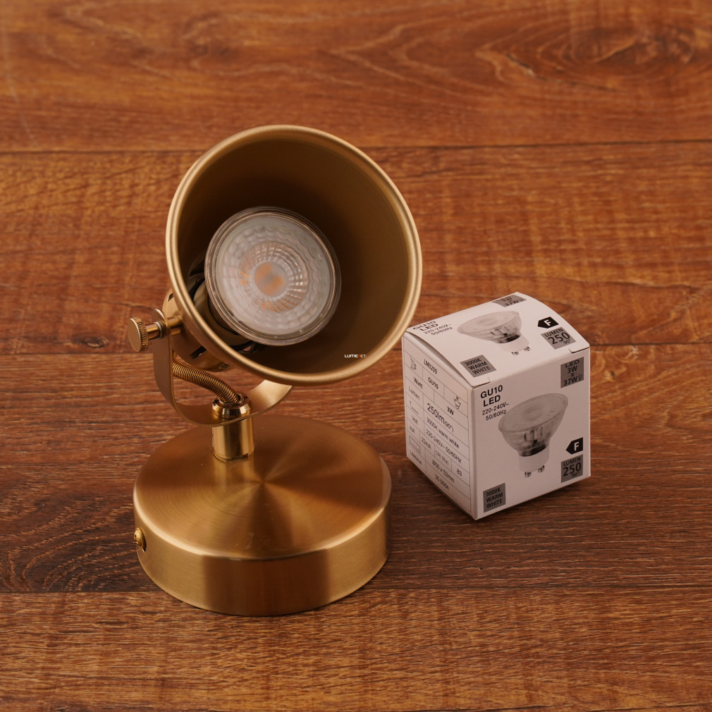 A Seras Eglo 900169 arany színű spot lámpa egy funkcionális kialakítású, fali elhelyezésre tervezett világítótest, amely acélból készült. A lámpatest 1 darab GU10 foglalattal rendelkezik, amelybe cserélhető, 3 W teljesítményű LED fényforrás tartozik, és a fényforrás a csomag része. A lámpa fényárama a cserélhető fényforrástól függ, a védettségi szintje IP20, így beltéri használatra alkalmas. A termék átmérője 100 mm, tömege 1,42 kg, csomagolási méretei 11 x 12 x 17 cm. A gyártó az EGLO, a termék logisztikai kódja 900169.