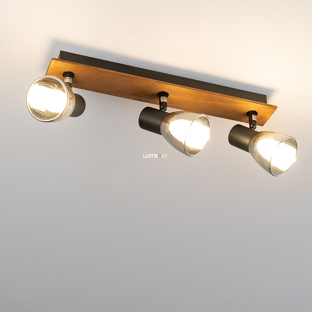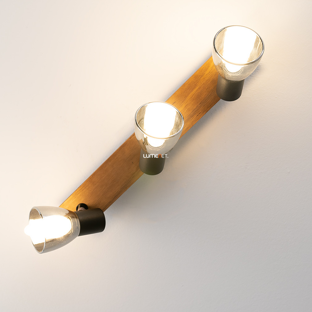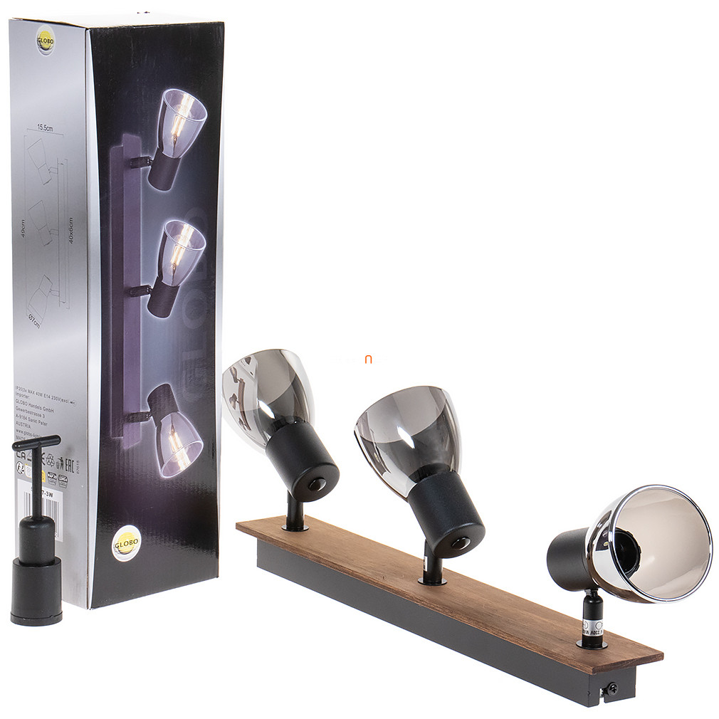A Spot lámpa fekete-fa - Claude Globo 54307-3W egy modern mennyezeti lámpa, amelyet a Globo gyártott. A lámpatest három darab E14 foglalattal rendelkezik, melyekbe cserélhető fényforrások helyezhetők, így a fényáram, a fényszín és a színhőmérséklet igény szerint szabályozható. A lámpa anyaga fém és üveg, felülete matt fekete, füstszínű és fa elemekkel kombinált. A termék IP20 védettséggel rendelkezik, amely beltéri használatra teszi alkalmassá. Méretei: hossza 400 mm, szélessége 70 mm, magassága 155 mm, tömege 0,99 kg. A csomagolás méretei: 8 cm széles, 12 cm hosszú, 40 cm magas. A lámpatest nem tartalmaz fényforrást, így a megfelelő E14 izzók külön vásárolhatók meg.