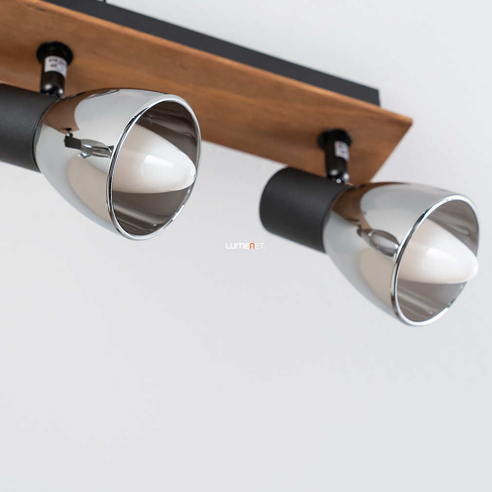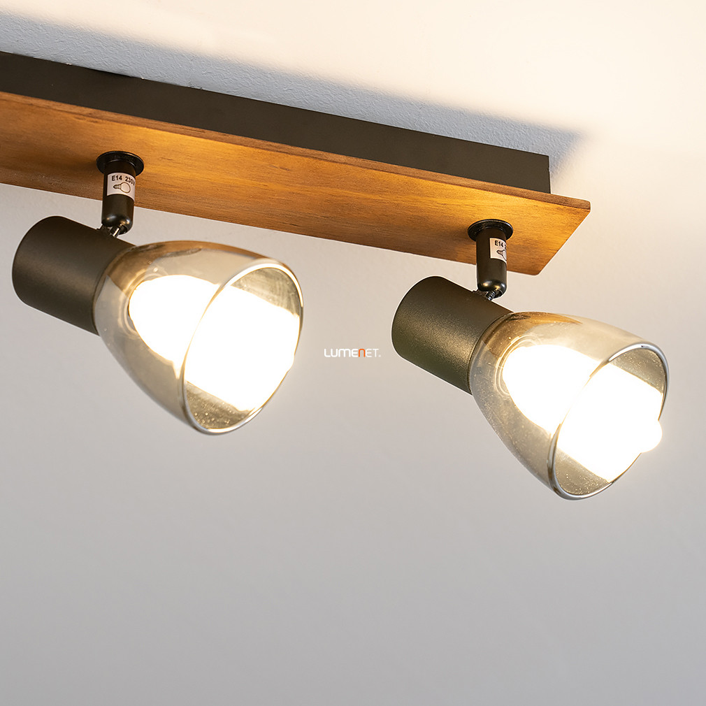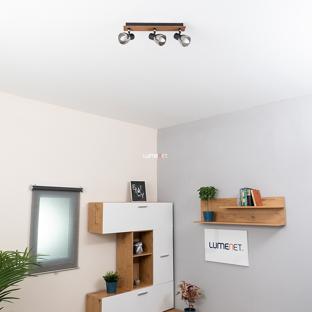 A Spot lámpa fekete-fa - Claude Globo 54307-3W egy modern mennyezeti lámpa, amelyet a Globo gyártott. A lámpatest három darab E14 foglalattal rendelkezik, melyekbe cserélhető fényforrások helyezhetők, így a fényáram, a fényszín és a színhőmérséklet igény szerint szabályozható. A lámpa anyaga fém és üveg, felülete matt fekete, füstszínű és fa elemekkel kombinált. A termék IP20 védettséggel rendelkezik, amely beltéri használatra teszi alkalmassá. Méretei: hossza 400 mm, szélessége 70 mm, magassága 155 mm, tömege 0,99 kg. A csomagolás méretei: 8 cm széles, 12 cm hosszú, 40 cm magas. A lámpatest nem tartalmaz fényforrást, így a megfelelő E14 izzók külön vásárolhatók meg.