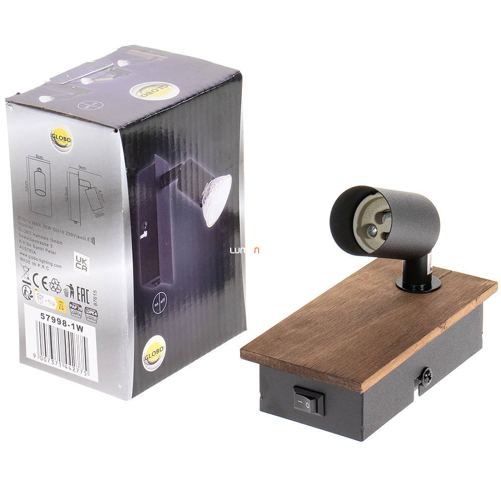 A Drew Globo 57998-1W spot lámpa egy modern, matt fekete és fa hatású fali lámpatest, amely 1 darab GU10 foglalattal rendelkezik, cserélhető fényforrás használatára tervezve. A lámpa billenőkapcsolóval vezérelhető, így egyszerűen működtethető. Fém anyagának köszönhetően tartós szerkezetű, és IP20 védettségi szintje beltéri használatra teszi alkalmassá. Méretei: 105 mm hosszúság, 60 mm szélesség, 90 mm magasság, tömege 0,21 kg. A termék nem tartalmaz fényforrást, a csomagolás méretei 6x8x12 cm. A lámpatestet a Globo gyártja.