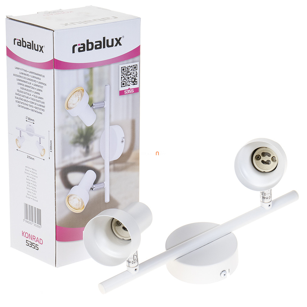 A Konrad Rábalux 5355 spot lámpa két darab GU10 foglalattal rendelkezik, cserélhető fényforrás használatára alkalmas. A lámpatest fém anyagból készült, fehér és króm színkombinációval. A lámpa méretei 275 mm hosszúság, 120 mm szélesség és 130 mm magasság, tömege 0,3 kg. A készülék IP20 védettségi besorolással rendelkezik, így beltéri használatra alkalmas. A fényerő, színhőmérséklet és teljesítmény a behelyezett GU10 fényforrástól függ, mivel a lámpa nem tartalmaz gyárilag fényforrást. A termék nem szabályozható, csomagolási méretei 12 cm hosszú, 9 cm széles és 7 cm magas. A gyártó a Rábalux.