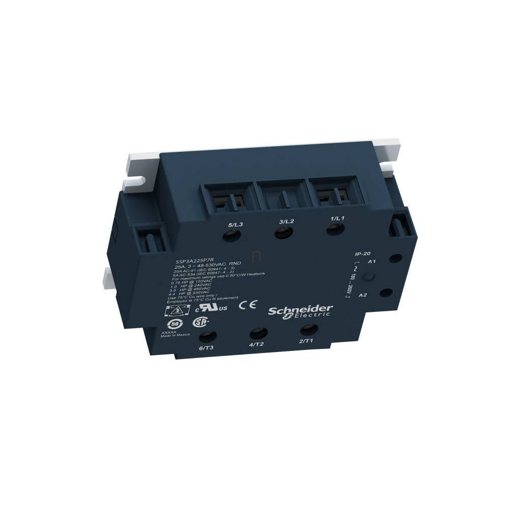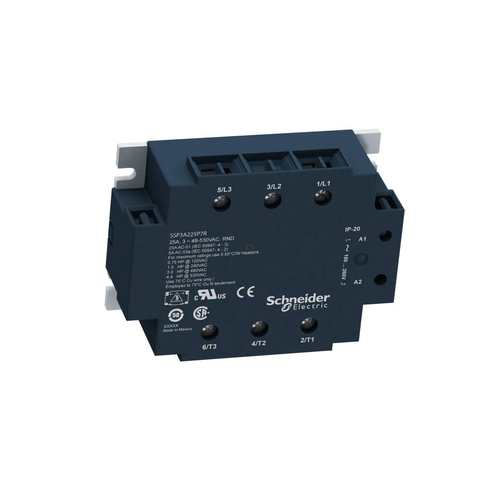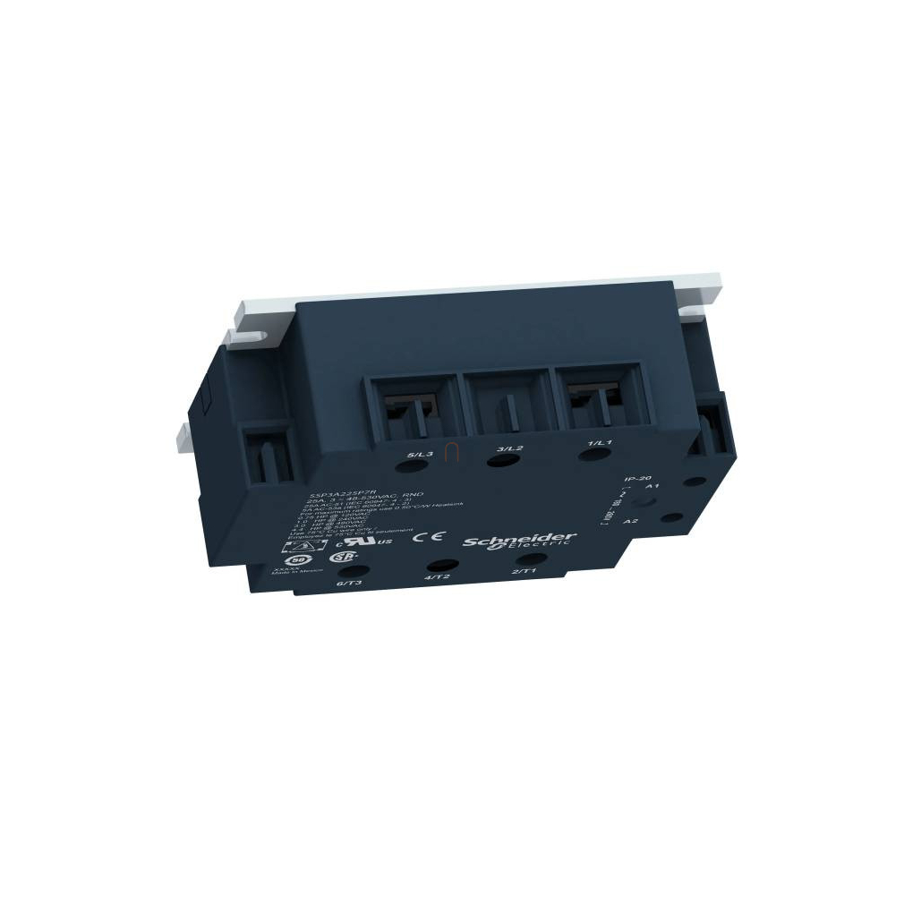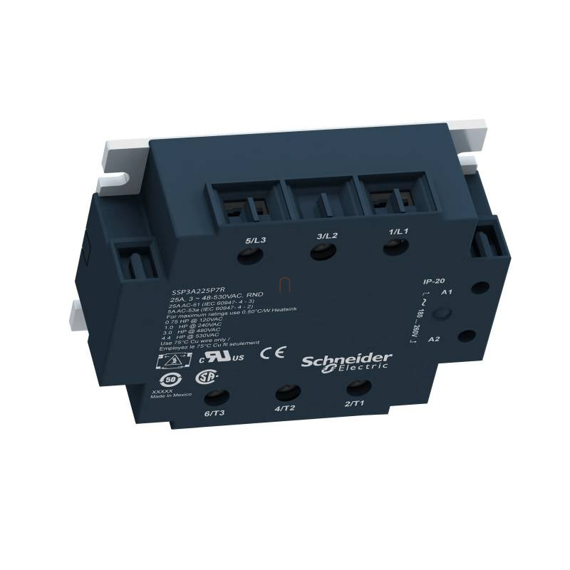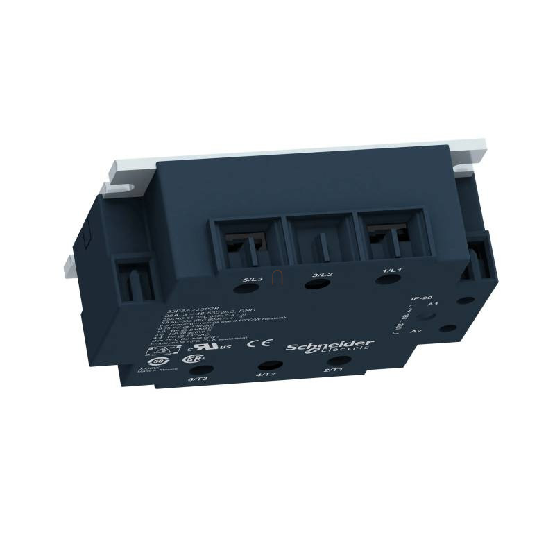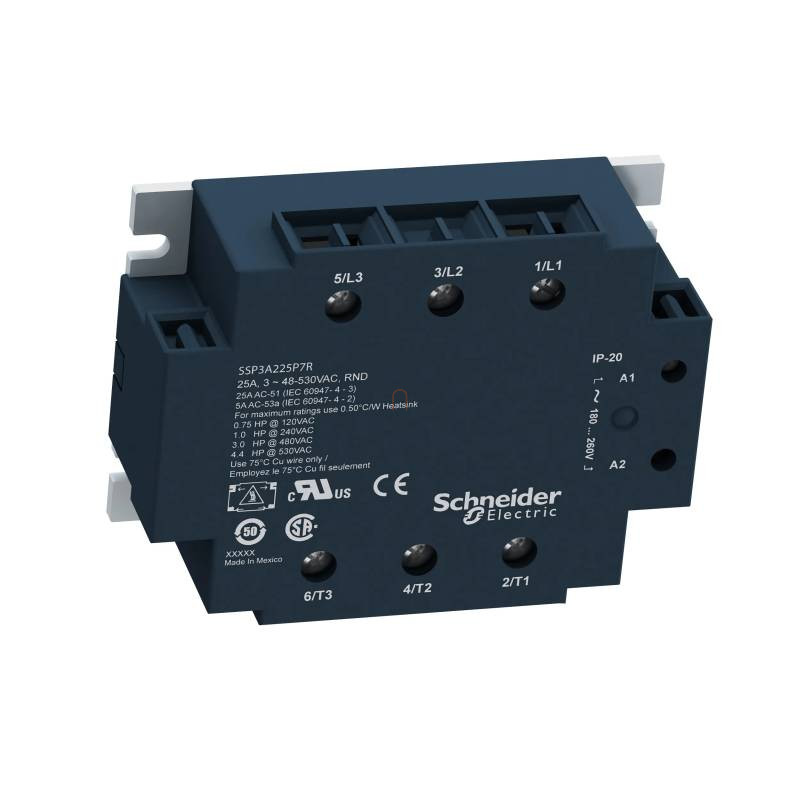 Ez a Zelio SSP panelre szerelhető háromfázisú szilárdtestrelé 50 A-es névleges áramerősségű, 180...280 VAC vezérlőfeszültséggel működik, névleges terhelési feszültsége 48...530 VAC. A relé azonnali kapcsolással működik, így ideális induktív terhelések vezérlésére. A készülék előlapján vizuális bemeneti állapotjelzés könnyíti meg az üzemkész állapot beazonosítását. Csendes és megbízható, mivel nem rendelkezik mozgóalkatrészekkel.