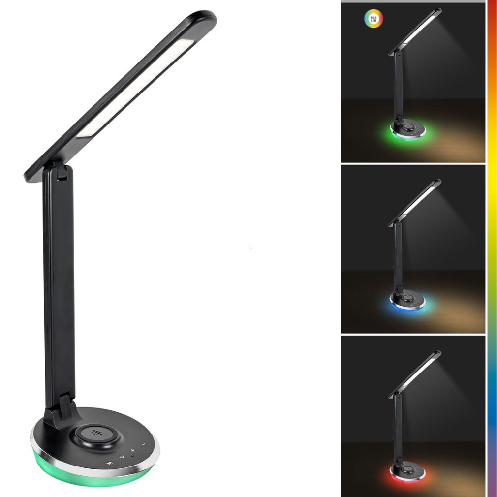 Szabályozható asztali LED lámpa színes talapzat világítással - Jacey Rábalux 74226, memória, szabályozható fényerősség, érintőkapcsolós, vezeték nélküli telefon töltő, 3000-4000-5000 K, 480 lm, 6 W, 12 V