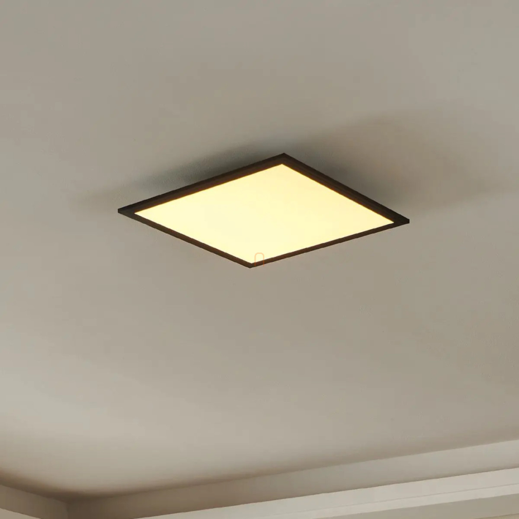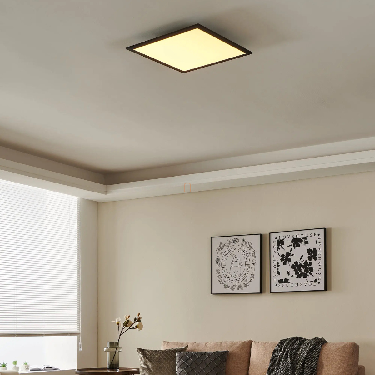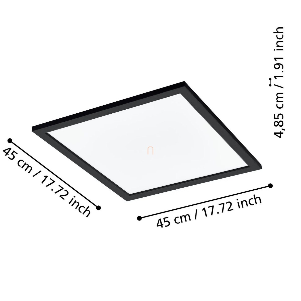 A Salobrena Eglo 900051 mennyezeti LED lámpa 21,5 wattos teljesítményével és 2500 lumen fényáramával alkalmas lakásvilágítási feladatokra. A lámpatest változtatható fehér fényű LED modullal szerelt, amely 2700 és 6500 Kelvin közötti színhőmérséklet-tartományban működik, így hideg és melegfehér fény is beállítható. A fényerő és a színhőmérséklet applikációval vagy távirányítóval szabályozható, utóbbi nem tartozék. A lámpa alumíniumból és műanyagból készült, fekete-fehér színkombinációban. A 450x450 mm-es méret és a 50 mm-es magasság modern, letisztult megjelenést biztosít. Az IP20 védettségi szint beltéri használatra teszi alkalmassá. A termék beépített LED modullal rendelkezik, külön fényforrás nem szükséges.