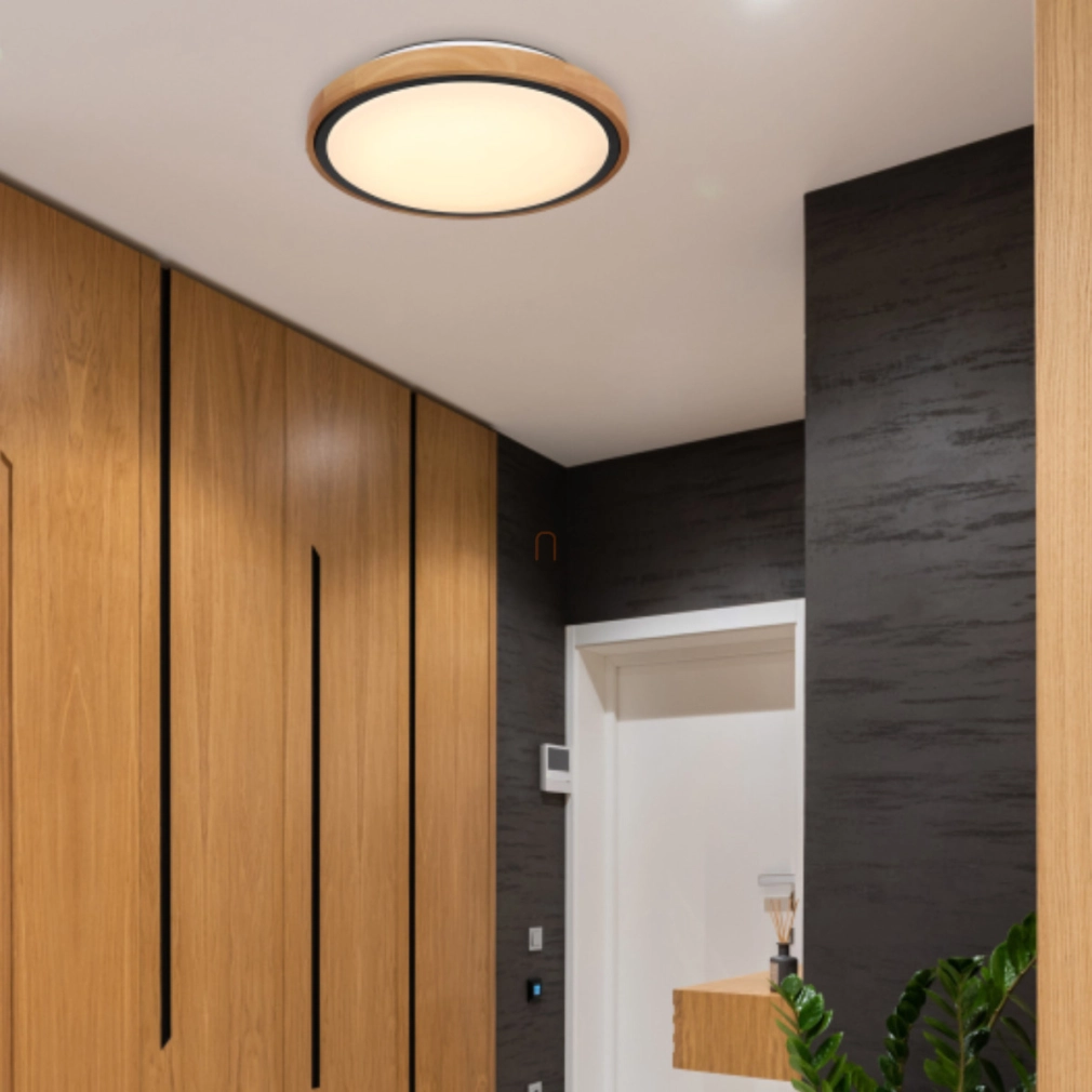 A Bruno Globo 41764-12 szabályozható mennyezeti LED lámpa modern, fa hatású kialakítással rendelkezik, amely harmonikusan illeszkedik különféle lakótér stílusokhoz. A lámpatest 24 W teljesítményű integrált LED modullal működik, amely 530 lumen fényáramot biztosít. A fény színhőmérséklete három lépésben szabályozható: 3000 K, 4500 K és 6000 K, így meleg, természetes vagy hideg fehér fény is beállítható. A termék anyaga fém és műanyag, színe matt fekete, opál és barna kombinációban jelenik meg. A lámpa átmérője 307 mm, magassága 90 mm, védettségi besorolása IP20, így beltéri használatra alkalmas. A névleges feszültség 230 V, a fényforrás nem cserélhető, mivel a LED modul a lámpatest része. A csomagolás méretei: 32x32x10 cm, a termék tömege 0,88 kg.
