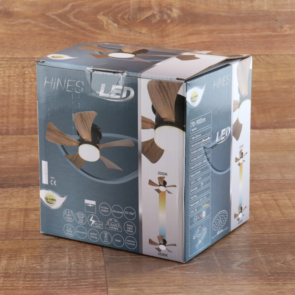 A Hines Globo 03609H szabályozható ventilátoros mennyezeti LED lámpa egy modern világítási megoldás, amely integrált 10 W-os LED modullal rendelkezik, 750 lumen fényáramot biztosítva. A lámpatest fém és műanyag anyagokból készült, matt fekete, opál és fa hatású felülettel. A fény színhőmérséklete 3000 és 6500 Kelvin között változtatható, így a világítás színe igény szerint állítható. A termék dimmelhető, memóriafunkcióval és időzítővel ellátott, valamint a mellékelt távirányítóval szabályozható. A lámpa átmérője 406 mm, magassága 130 mm, névleges feszültsége 230 V, védettségi besorolása IP20. A ventilátor funkció és a LED világítás együttesen biztosítja a helyiség optimális megvilágítását és levegőáramlását.