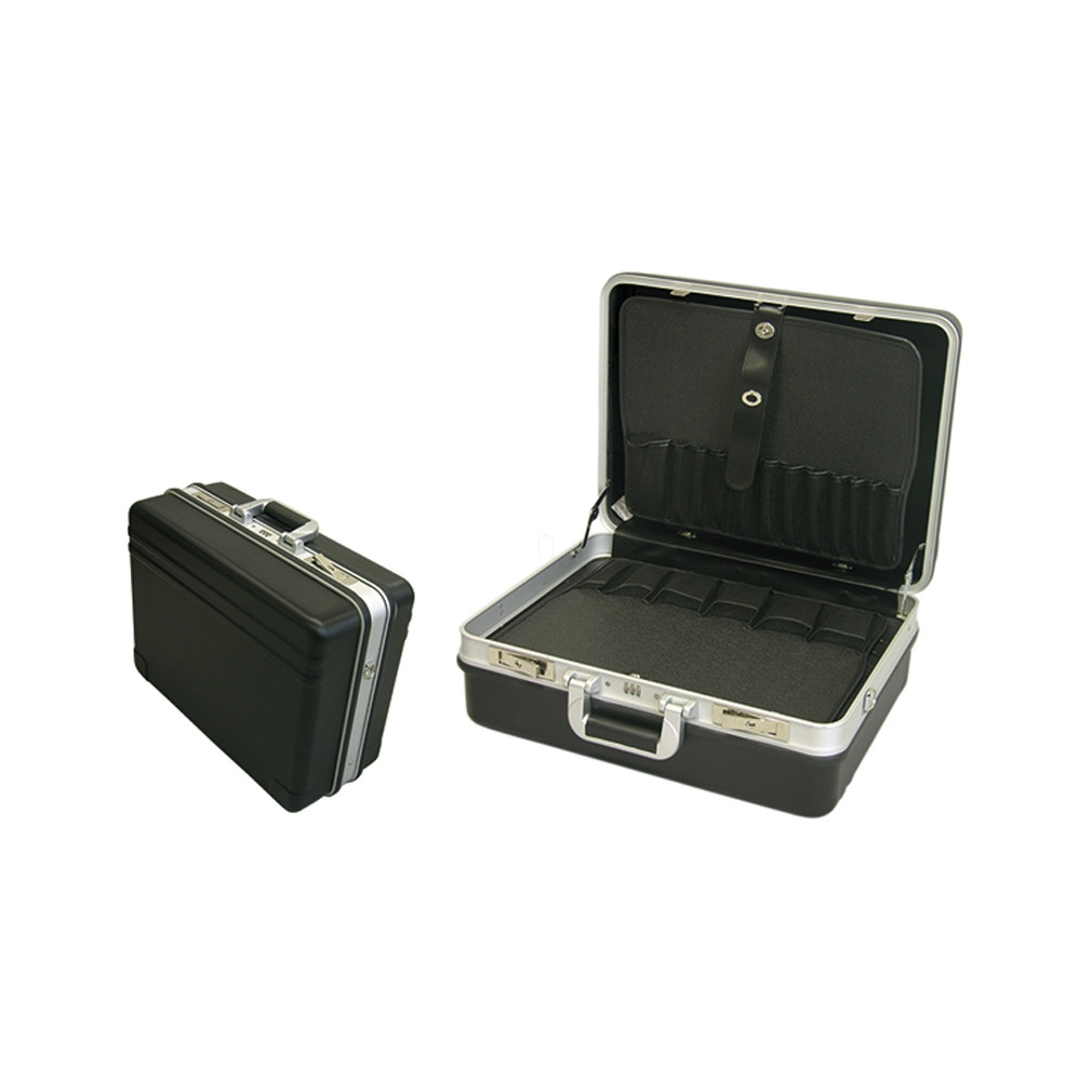 \nSzerszámkoffer „Start-up“ üresenKemény koffer, ABS -műanyagból, fekete, 2 szerszámtábla tépőzáras rögzítéssel, számzárral, dokumentációk részére zsebbel, padlórész variálható válaszfalakkal, hord szíjjal