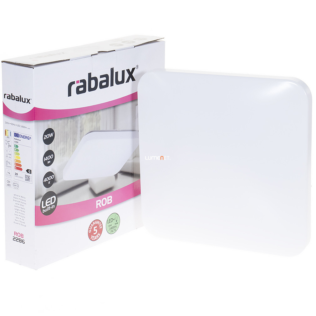 A Rob Rábalux 2286 szögletes LED mennyezeti lámpa lekerekített sarkokkal, modern stílusban, 280x280 mm méretű fehér fém és műanyag házzal rendelkezik. A 20 W teljesítményű LED modul 1400 lumen fényáramot biztosít, hidegfehér, 4000 K színhőmérsékletű fényt bocsátva ki, amely ideális általános világítást nyújt lakóterekben. A lámpatest IP20 védettséggel rendelkezik, így beltéri használatra alkalmas. A beépített LED fényforrás nem szabályozható, átlagos élettartama eléri a 25 000 órát. A termék tömege 0,68 kg, kompakt kialakítása és egyszerű felszerelhetősége révén jól illeszkedik bármely modern enteriőrbe.