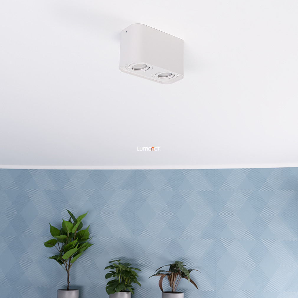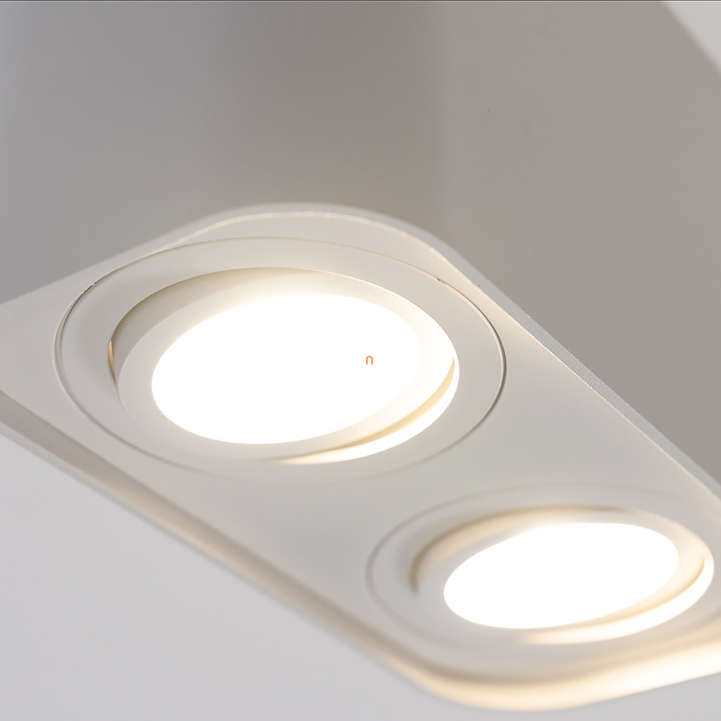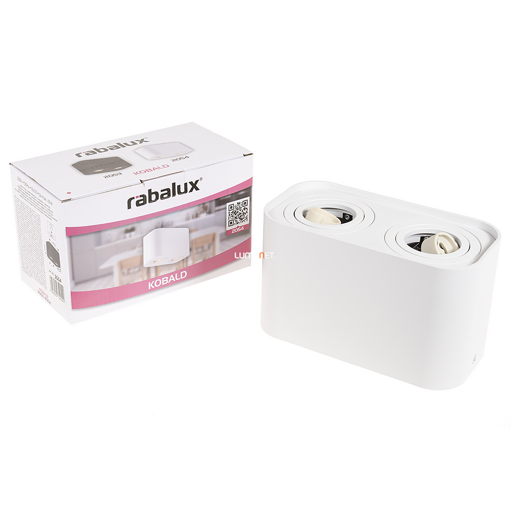 A Kobald Rábalux 2054 szögletes spot lámpa mennyezetre szerelhető kivitelben, dupla GU10 foglalattal rendelkezik, amely lehetővé teszi két cserélhető fényforrás alkalmazását. A lámpatest fehér színű, anyaga alumínium és fém, így biztosított a tartósság és a modern megjelenés. A funkcionális stílusú spotlámpa nem tartalmaz fényforrást, így a fényáram, fényszín, teljesítmény és színhőmérséklet a választott izzótól függően alakítható. Az IP20 védettségi szint beltéri használatra teszi alkalmassá. A lámpa 180 mm hosszú, 93 mm széles és 105 mm magas, tömege 0,82 kg. A termék nem szabályozható, és a csomagolás méretei: 18 cm x 9 cm x 11 cm. A Kobald Rábalux 2054 megfelel a modern lakásvilágítási igényeknek, ahol a letisztult formavilág és a megbízható anyaghasználat kiemelt szerepet kap.