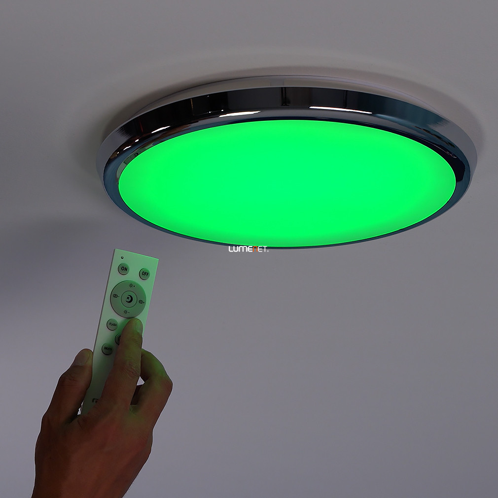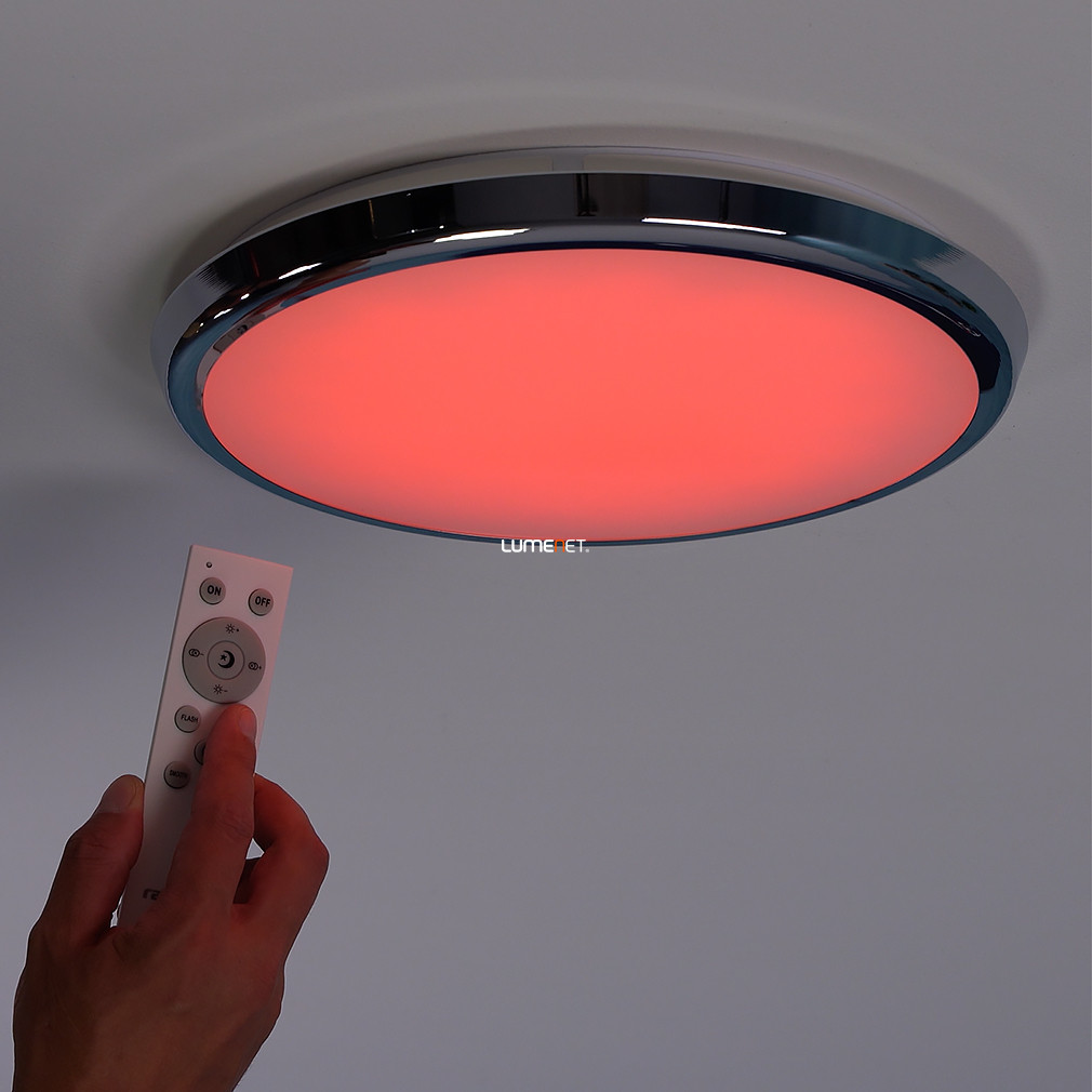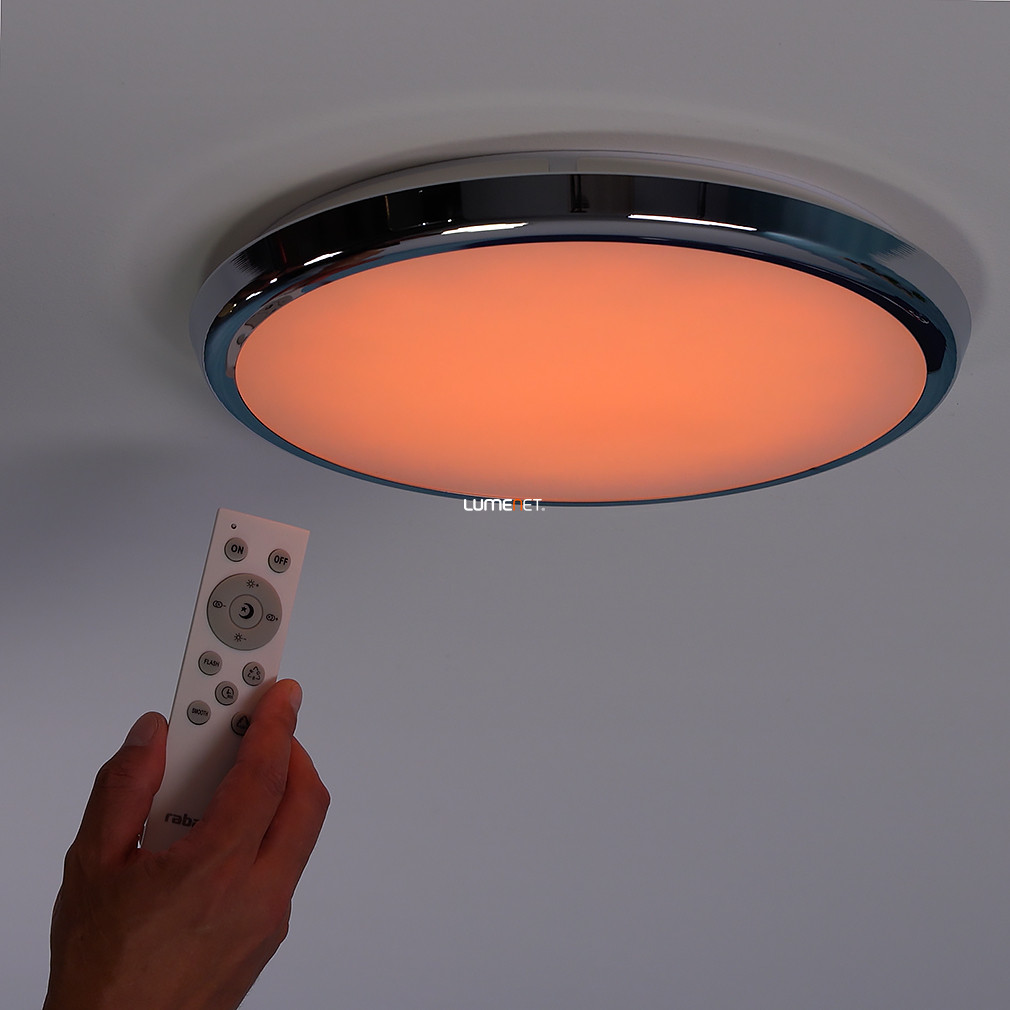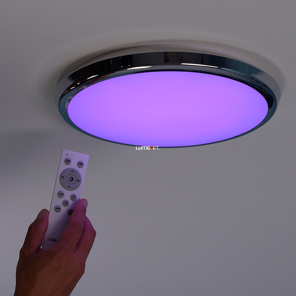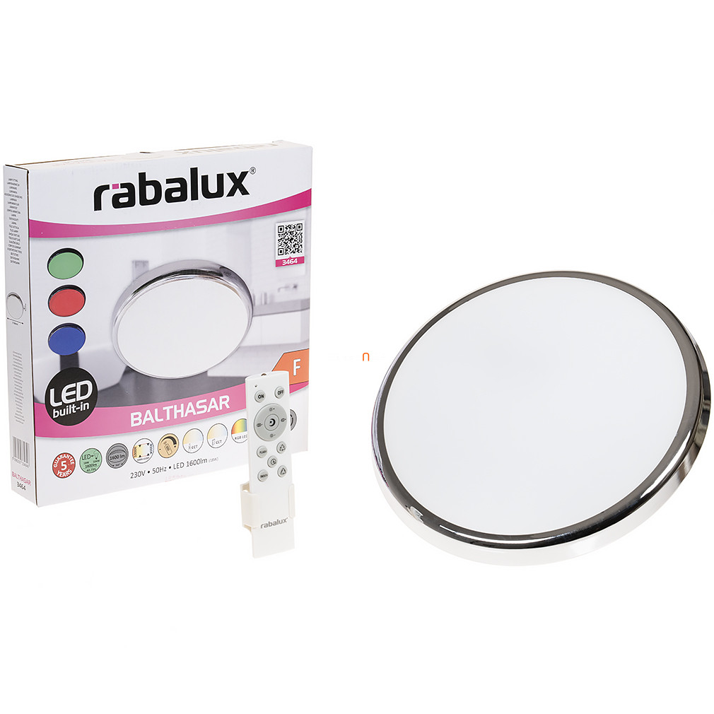 A Balthasar-RGBW Rábalux 3464 távirányítós fürdőszobai mennyezeti LED lámpa korszerű világítástechnológiával rendelkezik, amely 1600 lumen fényáramot és 18 W teljesítményű LED modult biztosít. A lámpa színhőmérséklete 3000-6500 Kelvin között állítható, továbbá RGBW funkcióval lehetővé teszi a fehér mellett a színes világítás kiválasztását is. A mellékelt távirányítóval szabályozható a fényerő, a színhőmérséklet, valamint elérhető időzítő és éjjeli fény funkció. A lámpatest IP44 védettségi szinttel rendelkezik, így alkalmas párás környezetben, például fürdőszobában történő alkalmazásra. A termék átmérője 300 mm, magassága 45 mm, anyaga fém és műanyag, színe króm és fehér. A LED modul beépített, átlagos élettartama 25 000 óra, a funkcionális stílusú lámpa modern megjelenést kölcsönöz a helyiségnek.