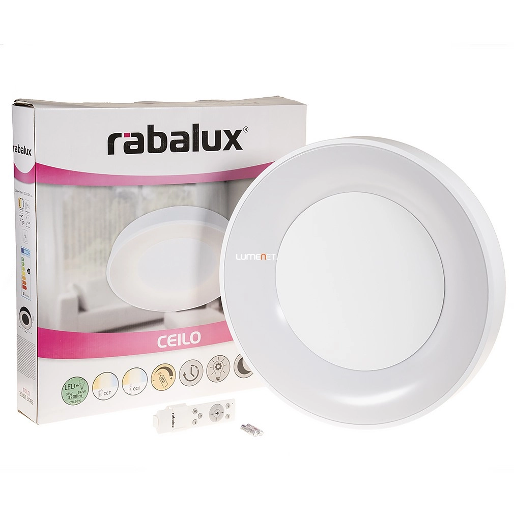A Ceilo Rábalux 3083 távirányítós mennyezeti LED lámpa korszerű világítási megoldást kínál lakóterek számára. A 38 W teljesítményű beépített LED modul 3200 lumen fényáramot biztosít, amelynek színhőmérséklete 3000 és 6500 Kelvin között változtatható, így a fény színe a meleg fehértől a hideg fehérig szabályozható. A lámpatest átmérője 480 mm, magassága 80 mm, anyaga fém és műanyag, színe fehér. A vezérléshez tartozék távirányító áll rendelkezésre, amely lehetővé teszi a fényerőszabályzást, a memóriafunkció, az időzítő és az éjjeli fény használatát. Az IP20 védettségű lámpa átlagos élettartama 30 000 óra. A termék LED fényforrást tartalmaz, foglalata LED modul, csomagolási méretei 52x53x10 cm, tömege 2,18 kg.