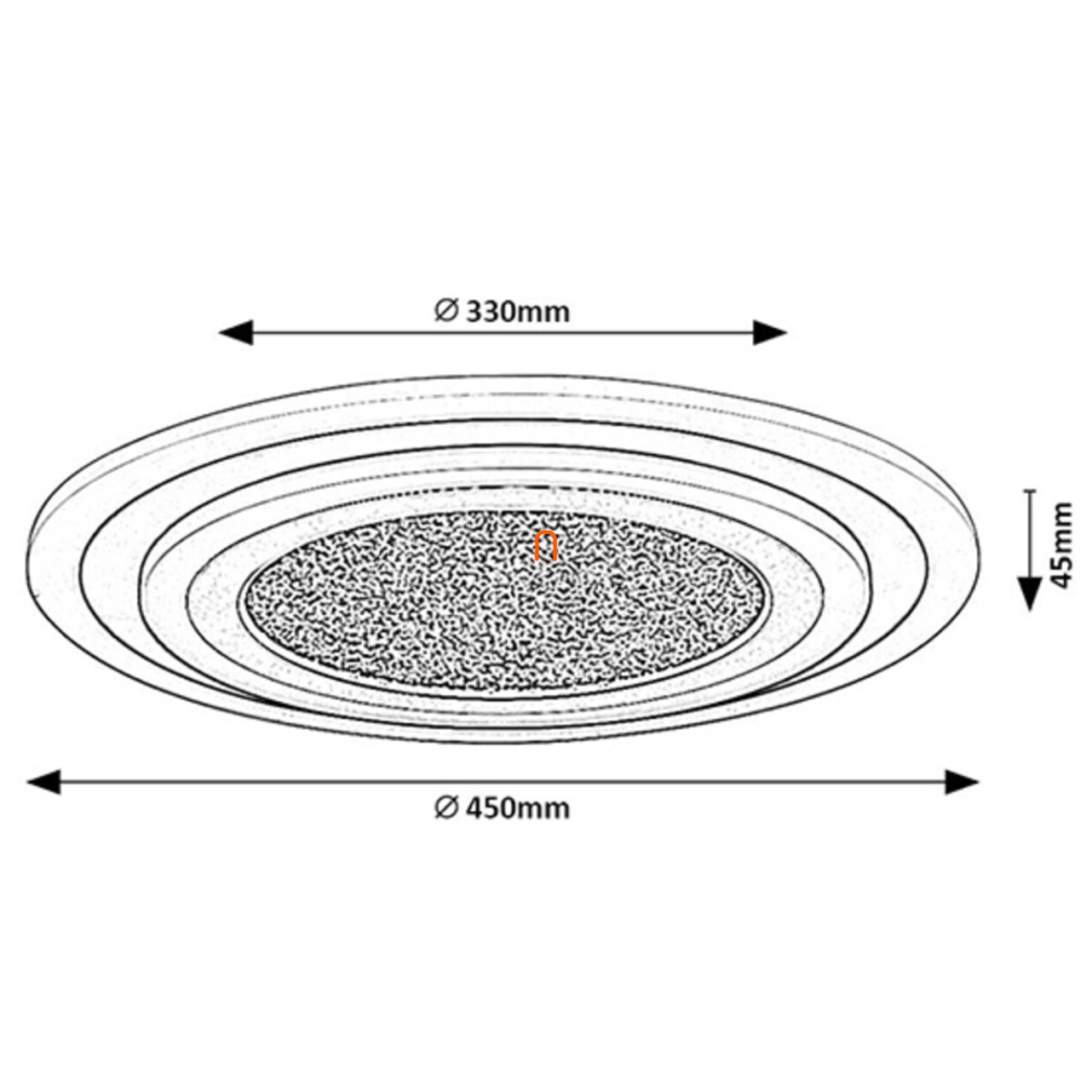 A Taneli 2 Rábalux 71316 mennyezeti LED lámpa modern, letisztult formavilágával és fekete-króm színkombinációjával illeszkedik a korszerű belső terekhez. A 45 cm átmérőjű lámpatest fém és műanyag anyaghasználatával hosszú élettartamot biztosít, amely eléri a 20 000 órát. A beépített 56 W teljesítményű LED modul 3050 lumen fényáramot biztosít, miközben a színhőmérséklet 3000, 4000 és 6000 Kelvin között szabályozható, így meleg, semleges vagy hideg fehér fény is beállítható. A fényerő és a színhőmérséklet vezérlése a mellékelt távirányítóval történik, amely kényelmes használatot tesz lehetővé. A lámpa 230 V névleges feszültséggel működik, energiaosztálya F, védettsége IP20. A termék magassága 4,5 cm, tömege 2,15 kg, gyártója a Rábalux.