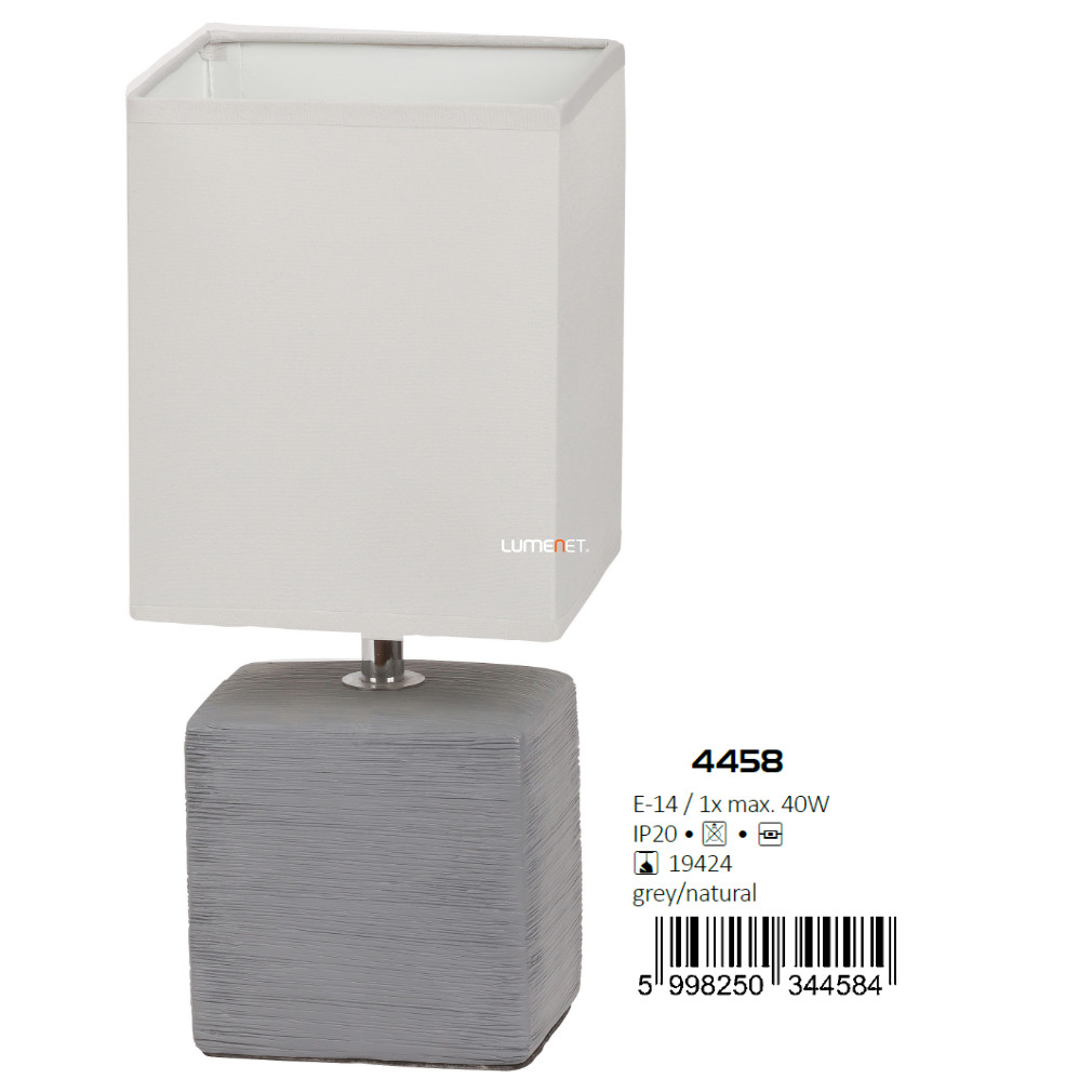Az Orlando Rábalux 4458 textil asztali lámpa modern stílusú, szögletes kialakításával és 30 cm-es magasságával ideális választás bármely enteriőrbe. A lámpatest fehér és szürke színvilágban, kerámia talppal és textil burával készül, amely letisztult megjelenést biztosít. Egy darab E14 foglalattal rendelkezik, amelyhez a fényforrás külön választható, így a fényáram, színhőmérséklet és teljesítmény a felhasználó igényeihez igazítható. A lámpa IP20 védettségi szinttel rendelkezik, tehát beltéri használatra alkalmas. Zsinórkapcsolóval vezérelhető, nem szabályozható. A termék tömege 0,7 kg, szélessége 13,5 cm, magassága 30 cm. Csomagolási méretei: 13 cm szélesség, 11 cm hosszúság, 18 cm magasság. A lámpát a Rábalux gyártja.
