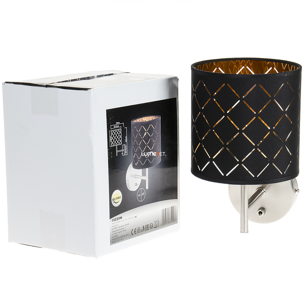 A Clarke Globo 15229W textil falikar modern stílusban készült, fekete-arany színű, rácsmintás textil ernyővel és fém vázzal. A lámpatest egy darab E14-es foglalattal rendelkezik, amelybe cserélhető fényforrás helyezhető. A termék nem tartalmaz fényforrást, valamint nem szabályozható. A falikar IP20-as védettséggel ellátott, beltéri használatra alkalmas. A lámpa szélessége 150 mm, magassága 260 mm, tömege 0,47 kg. A csomagolás méretei: 16 cm széles, 19 cm hosszú, 22 cm magas. A gyártó a Globo.