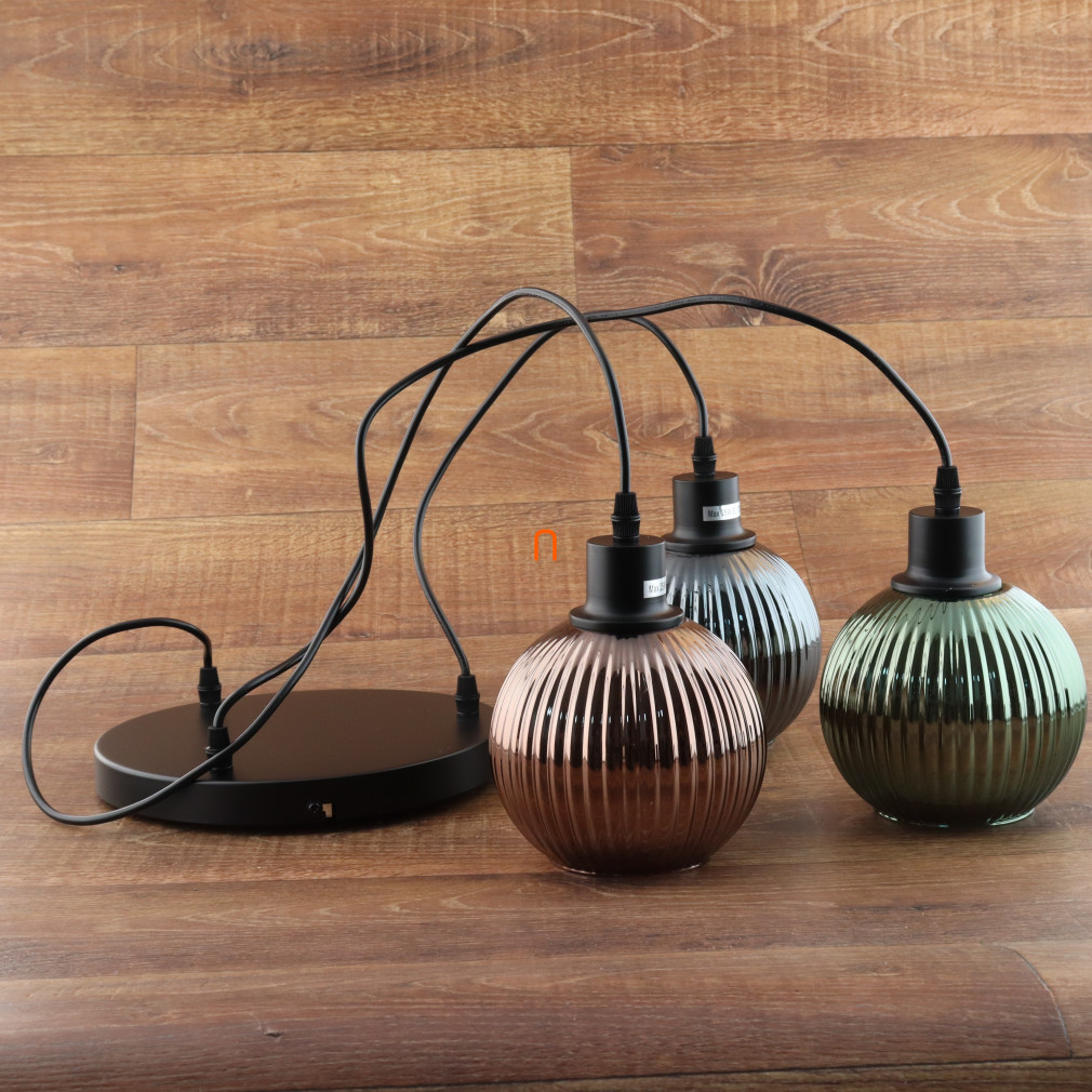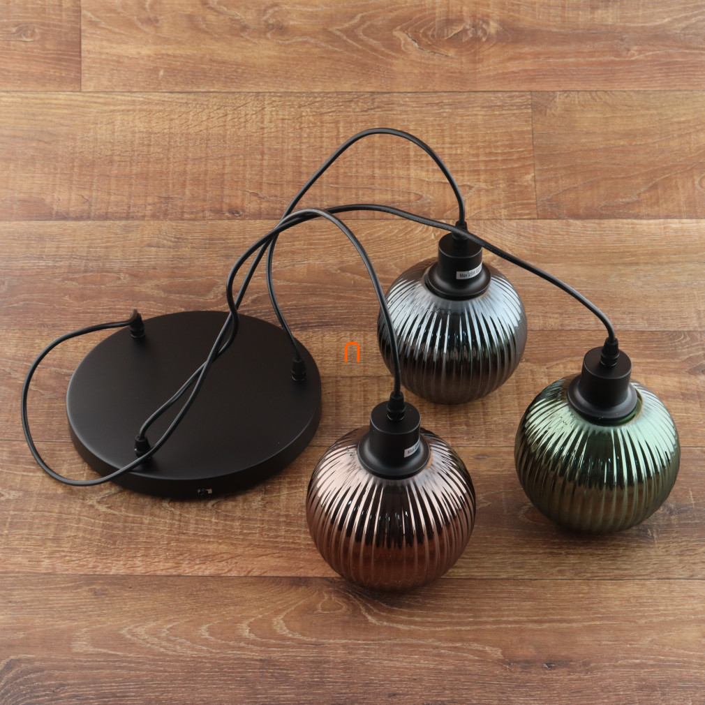 A Trikolor függesztett lámpa bordázott üveg búrával, Zumba Globo 15638-3 modell, három darab E27 foglalattal rendelkezik, így cserélhető fényforrások használatára alkalmas. A lámpatest anyaga fém és üveg, felülete matt fekete színű, amely modern megjelenést kölcsönöz a lakótérnek. A lámpa átmérője 360 mm, magassága 1200 mm, védettségi besorolása IP20, így beltéri használatra fejlesztették. A termék névleges feszültsége 230 V, a csomagolás mérete 37x38x26 cm, tömege 2,13 kg. A fényforrás nem tartozék, a lámpa kompatibilis különböző színhőmérsékletű és teljesítményű E27 fényforrásokkal. A terméket a Globo. gyártja.