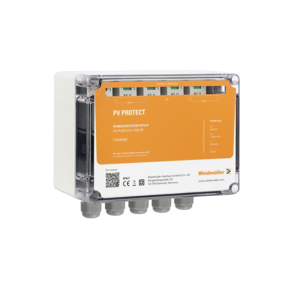 Túlfeszültség-védelmi készülék IP 67-es házban, napelemes rendszerekhez, 2 munkapont 2 sztring párhuzamosítására, T2-es túlfeszültségi védelem, PV 1100VDC, tömszelencés kábelbevezetés 2755960000 Weidmüller