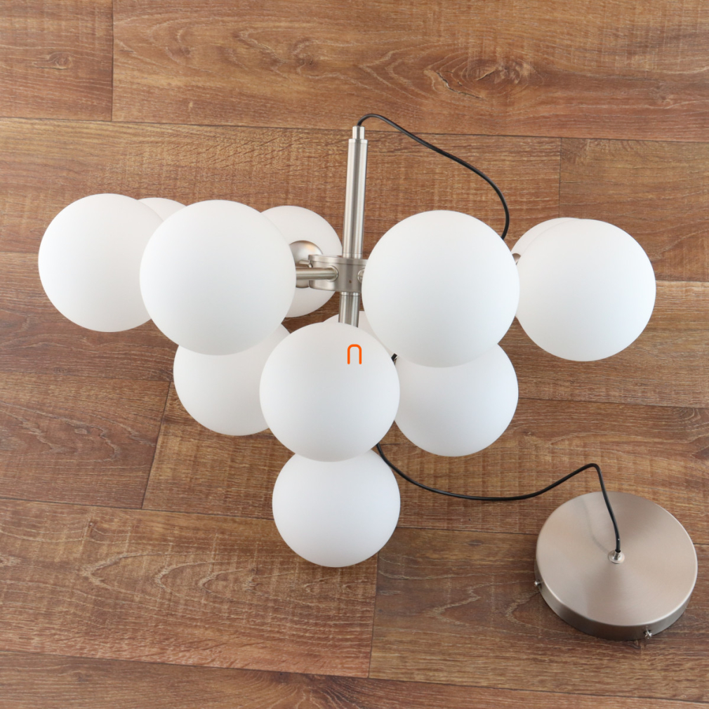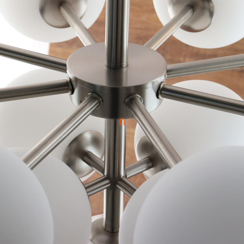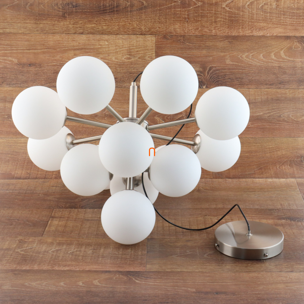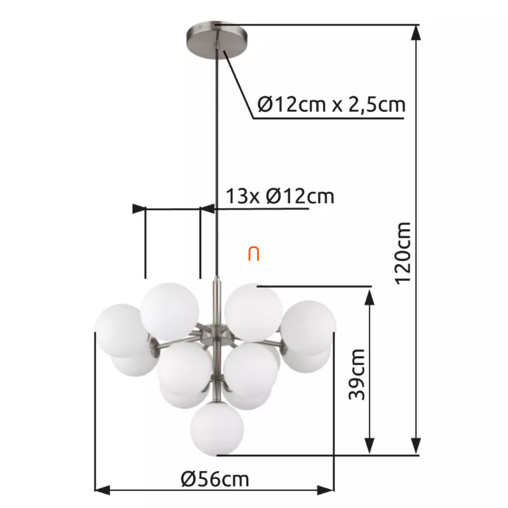 A Grappy Globo 56143-13N üveggömbös függesztett lámpa modern formavilágával és minőségi anyaghasználatával illeszkedik a korszerű lakásvilágítási igényekhez. A lámpatest nikkel és opál színű felületek kombinációjával készül, anyaga fém és üveg, amely tartósságot és esztétikus megjelenést biztosít. A lámpa 13 darab G9 foglalattal van ellátva, amelyek mindegyike cserélhető fényforrás befogadására alkalmas, így a fényáram, színhőmérséklet és teljesítmény igény szerint alakítható. A lámpatest átmérője 560 mm, magassága 1200 mm, védettségi szintje IP20, ami beltéri használatra teszi alkalmassá. A névleges feszültség 230 V, a termék tömege 4,79 kg. A csomagolási méretek: 58x58x35 cm. A lámpa nem tartalmaz fényforrást, így a felhasználó szabadon választhatja meg a megfelelő izzókat. A Grappy Globo 56143-13N logisztikai kódja 56143-13N, gyártója a Globo.