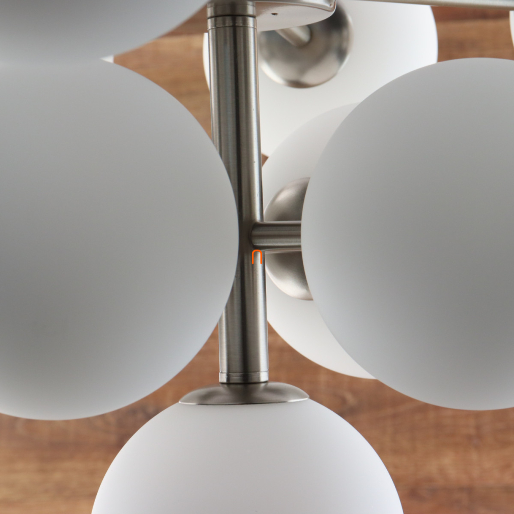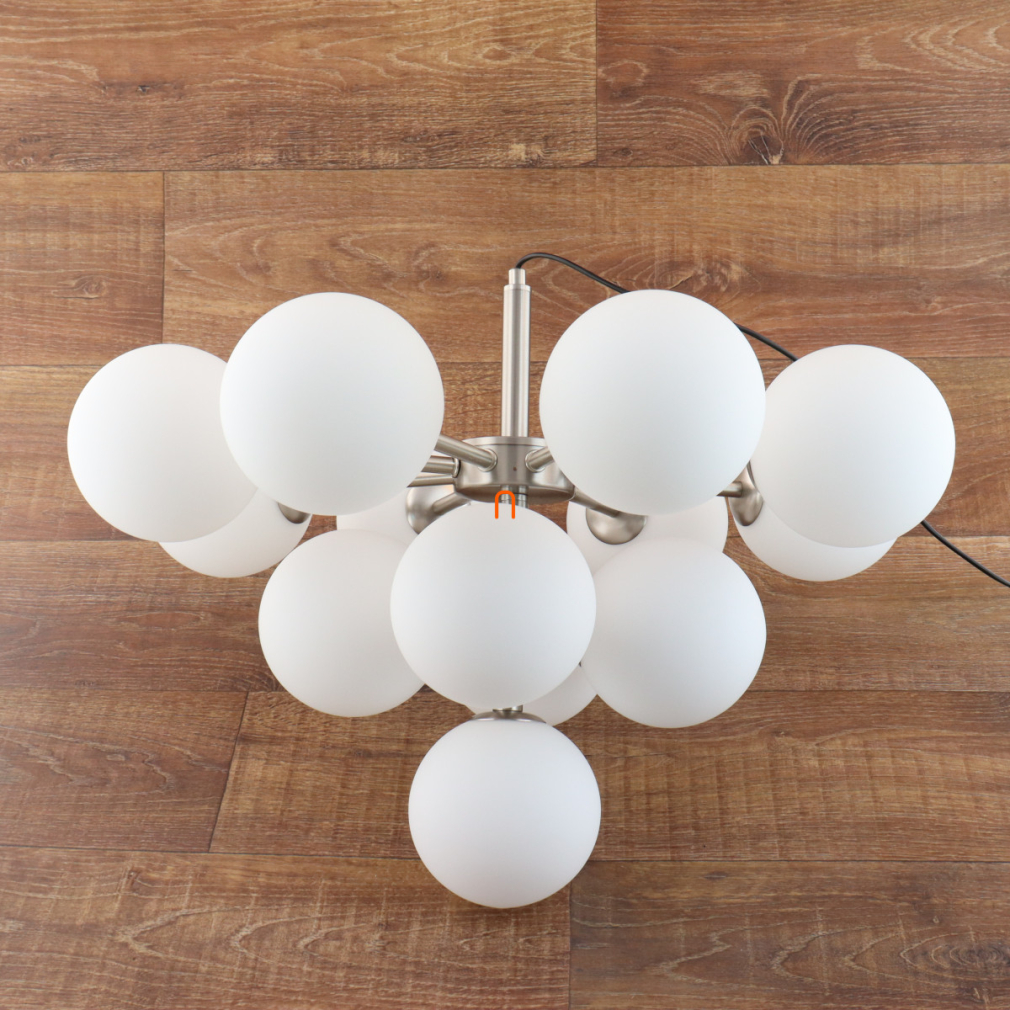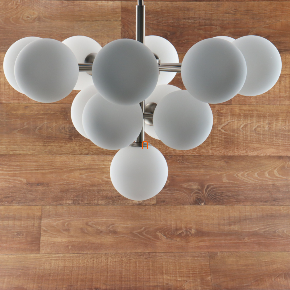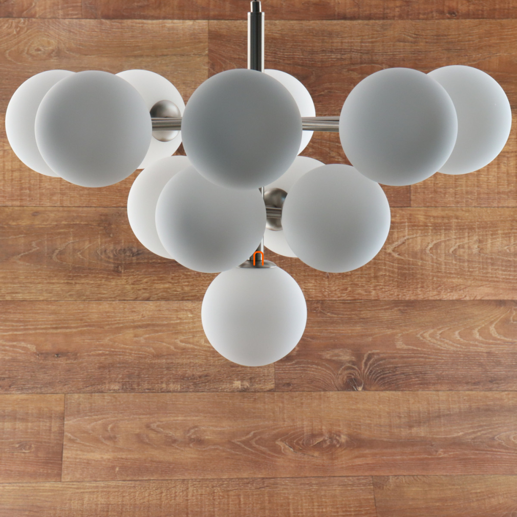 A Grappy Globo 56143-13N üveggömbös függesztett lámpa modern formavilágával és minőségi anyaghasználatával illeszkedik a korszerű lakásvilágítási igényekhez. A lámpatest nikkel és opál színű felületek kombinációjával készül, anyaga fém és üveg, amely tartósságot és esztétikus megjelenést biztosít. A lámpa 13 darab G9 foglalattal van ellátva, amelyek mindegyike cserélhető fényforrás befogadására alkalmas, így a fényáram, színhőmérséklet és teljesítmény igény szerint alakítható. A lámpatest átmérője 560 mm, magassága 1200 mm, védettségi szintje IP20, ami beltéri használatra teszi alkalmassá. A névleges feszültség 230 V, a termék tömege 4,79 kg. A csomagolási méretek: 58x58x35 cm. A lámpa nem tartalmaz fényforrást, így a felhasználó szabadon választhatja meg a megfelelő izzókat. A Grappy Globo 56143-13N logisztikai kódja 56143-13N, gyártója a Globo.