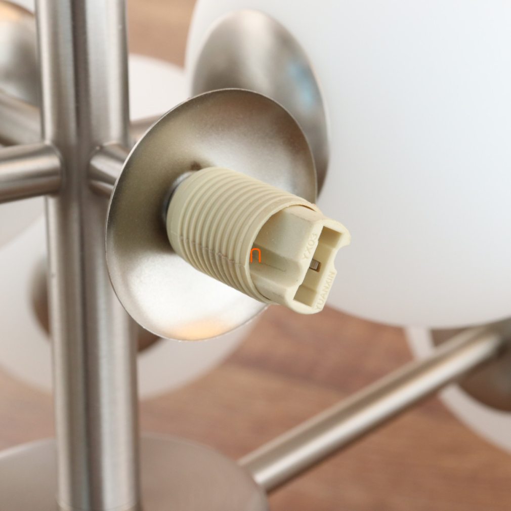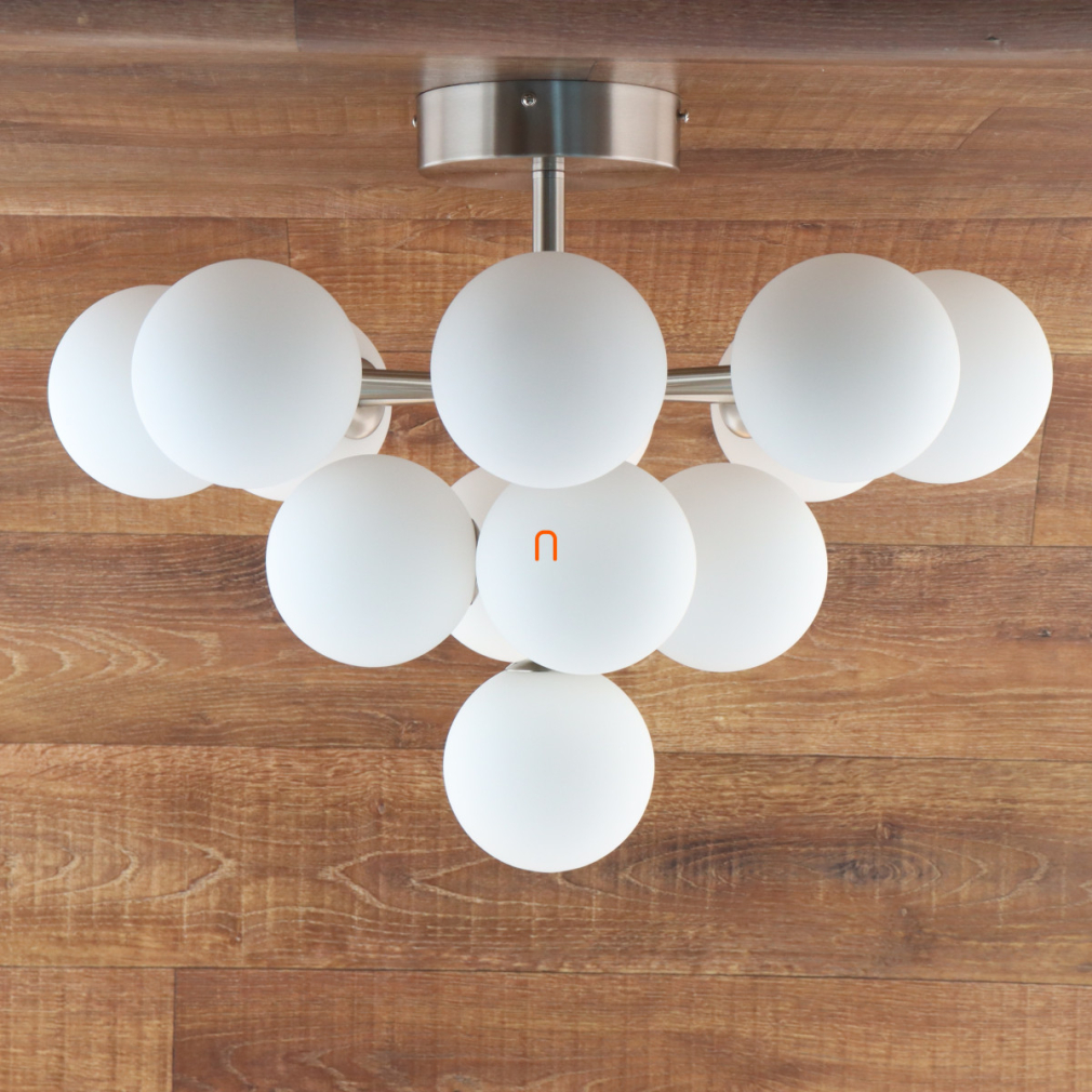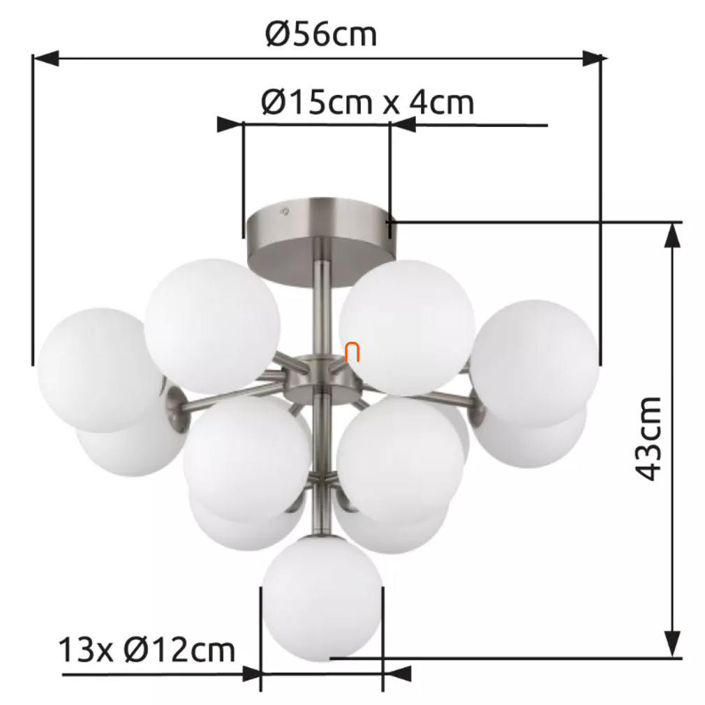 A Grappy Globo 56143-13ND üveggömbös mennyezeti lámpa modern kialakításával és nikkel-opál színkombinációjával tűnik ki. A lámpatest 13 darab G9 foglalattal rendelkezik, melyekbe cserélhető fényforrások helyezhetők, így a fényáram, fényszín és színhőmérséklet igény szerint alakítható. A termék 230 V névleges feszültségen működik, anyaga fém és üveg, melyek stabilitást és elegáns megjelenést biztosítanak. Az 560 mm átmérőjű és 430 mm magasságú lámpatest IP20 védettségi besorolással rendelkezik, így beltéri használatra alkalmas. A lámpa nem tartalmaz fényforrást, a csomagolás méretei 58x58x35 cm, tömege 4,79 kg. A terméket a Globo gyártja.