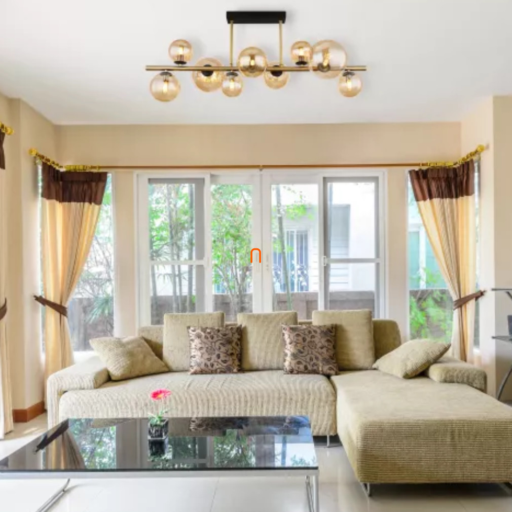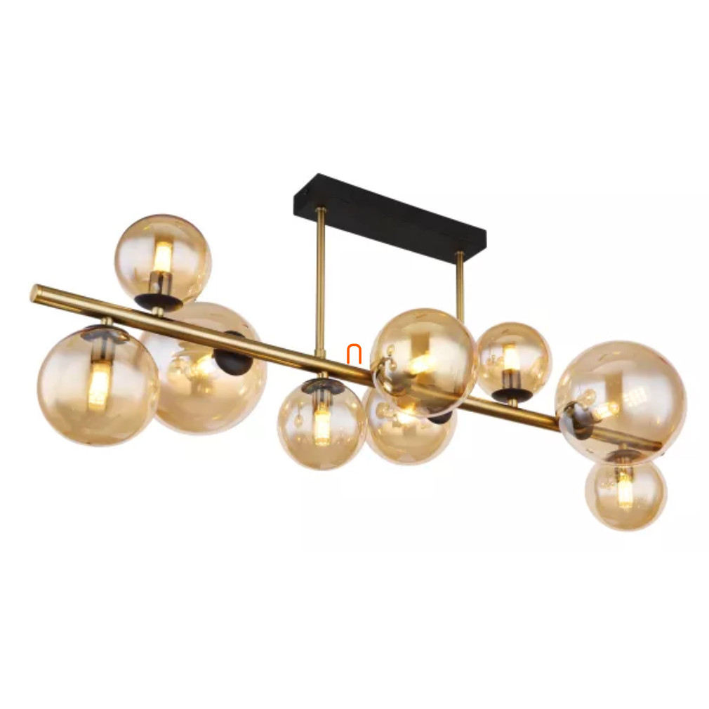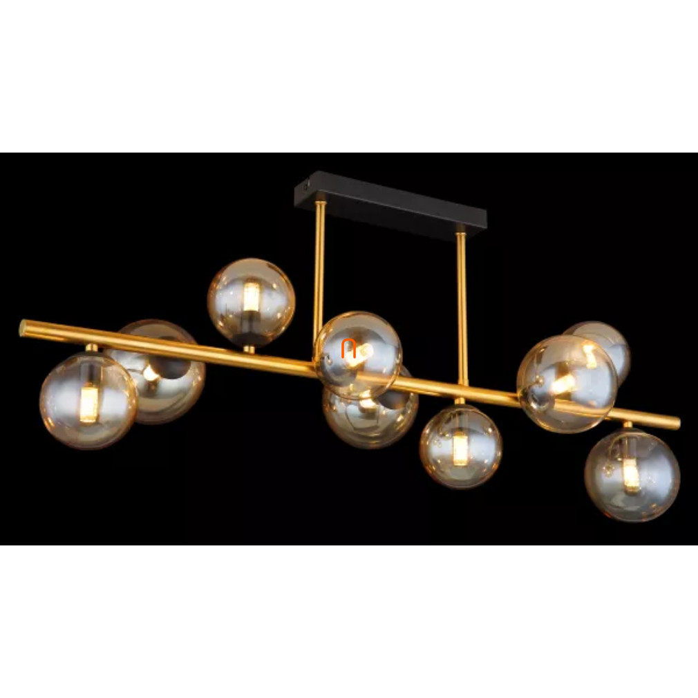 Ez a sárgaréz színű üveggömbös mennyezeti lámpa elegáns megjelenésével és kilenc foglalatával tökéletes választás bármely modern otthonba.