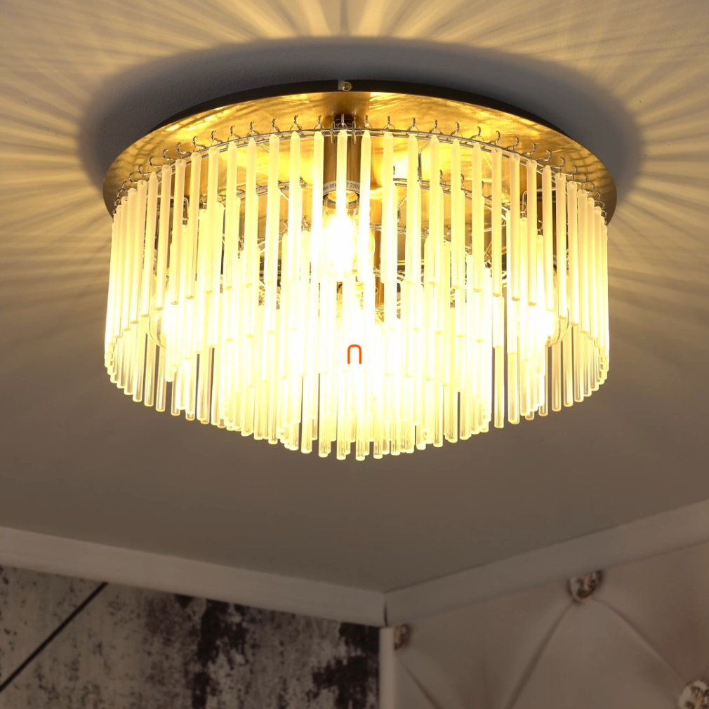 Ez a mennyezeti lámpa elegáns fehér-arany színével és üvegpálcás kialakításával bármelyik szobát fényűzővé varázsolja.