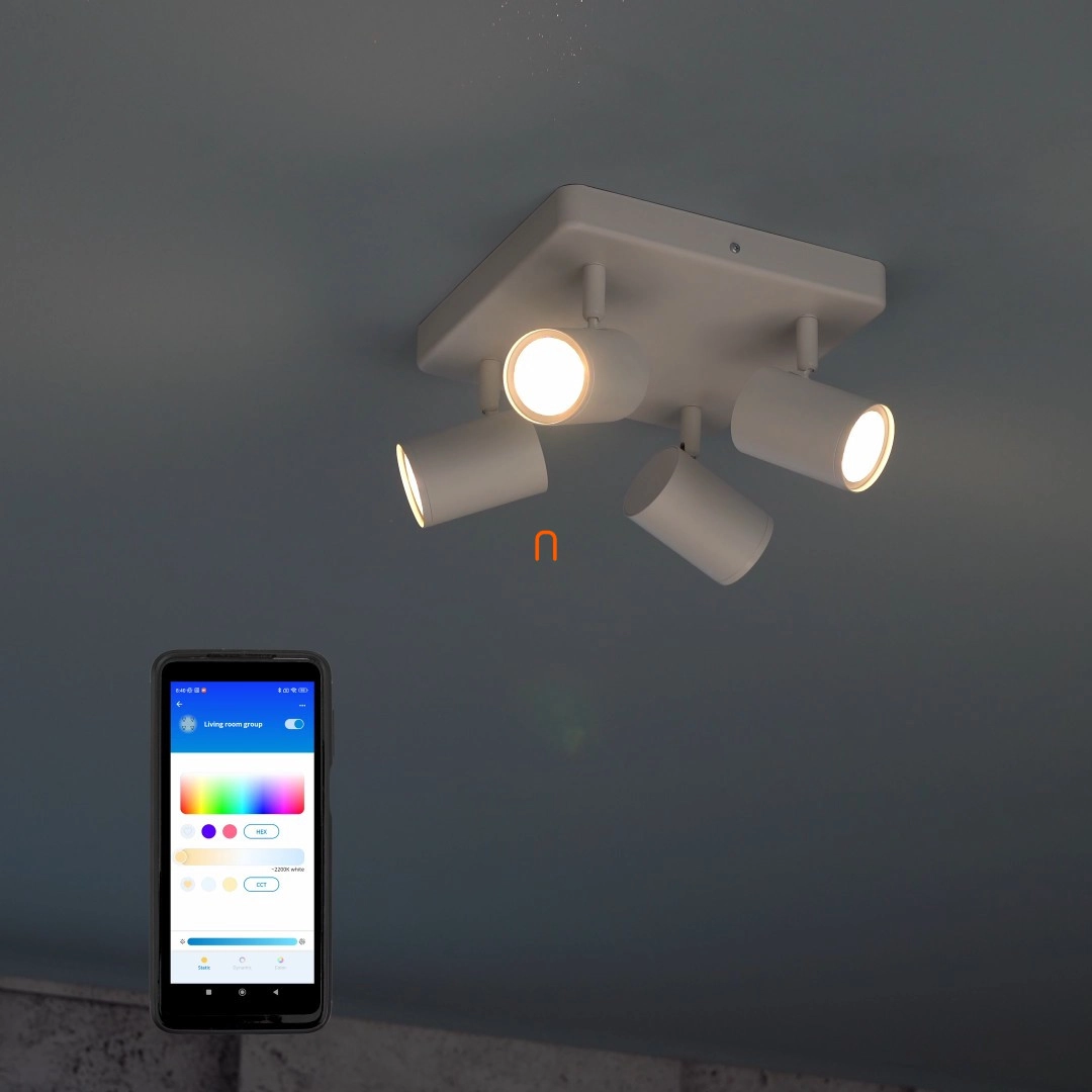 A WiZ Imageo 4x5W 1380lm RGBW mennyezeti spot lámpa négyzet alakú, fehér színű kialakítással rendelkezik, amely modern megjelenést kölcsönöz a belső tereknek. A lámpatest négy darab GU10 foglalattal ellátott, összesen 20 W teljesítményű LED modult tartalmaz, amely 1380 lumen fényáramot biztosít. A fény színe és színhőmérséklete széles tartományban, 2200 és 6500 Kelvin között változtatható, valamint RGBW technológiájának köszönhetően színes világítás is elérhető. A fényerő szabályozható, a vezérlés Bluetooth és Wi-Fi kapcsolaton keresztül történik, így kompatibilis okosotthon rendszerekkel is. A lámpa IP20-as védettséggel rendelkezik, beltéri használatra alkalmas. A termék átlagos élettartama 15 000 óra, méretei 220x220x123 mm. A csomag tartalmazza a fényforrásokat is, a gyártó Signify.