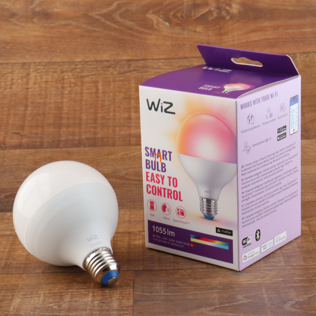WiZ okos E27 LED, opál, nagygömb 11 W, 640 lm, 2200-6500 K +RGB, szabályozható fehér és szín-75 W izzó helyett, 220-240 V, applikációval vezérelhető, Wi-fi