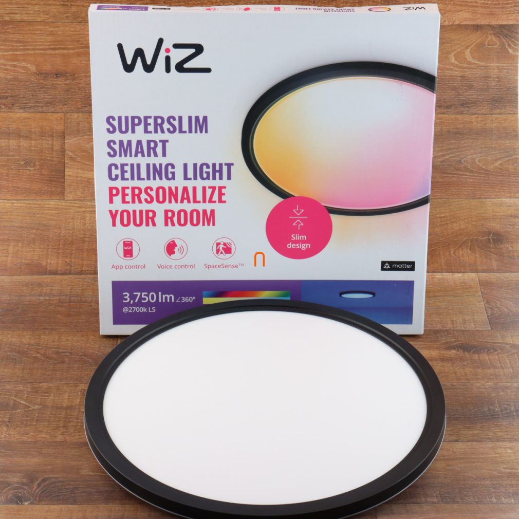 A WiZ okos mennyezeti LED lámpa SuperSlim RGBW kivitelben 32 W teljesítményű, 3750 lumen fényáramú világítási megoldás, mely 2200-6500 K között szabályozható színhőmérséklettel és RGBW színváltó funkcióval rendelkezik. A lámpatest beépített LED modullal működik, névleges feszültsége 220-240 V, fényhasznosítása 118 lm/W, színvisszaadási indexe CRI 80.0. Átlagos élettartama 20 000 óra. A lámpa fekete színű, műanyag házzal, átmérője 545 mm, magassága 38 mm. Wi-fi kapcsolaton keresztül vezérelhető, IP20 védettséggel rendelkezik. A termék csomagolási méretei: 3 cm szélesség, 54 cm hosszúság, 55 cm magasság. Gyártója a Signify, a márka Philips.
