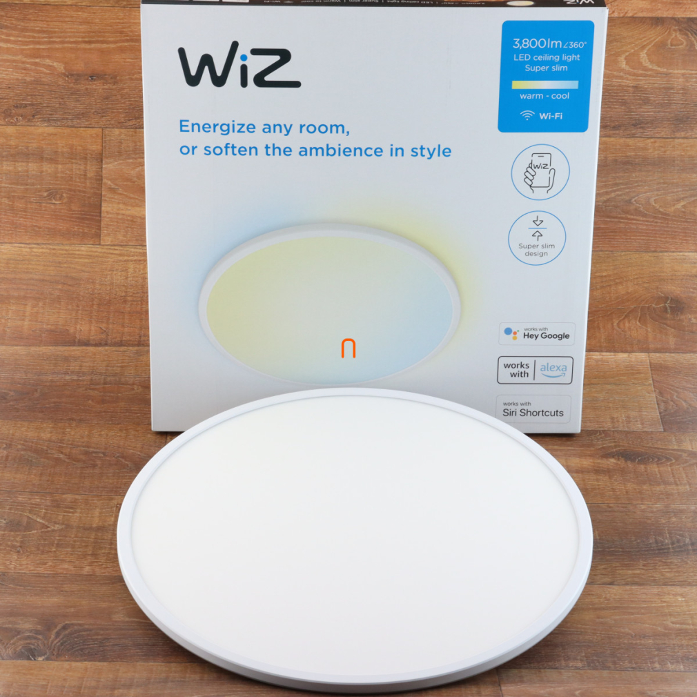 A WiZ Super Slim mennyezeti LED lámpa 36W-os teljesítményével és 3800 lumen fényáramával biztosítja a hatékony lakásvilágítást. A lámpatest színhőmérséklete 2700 és 6500 Kelvin között változtatható, így meleg és hideg fehér fény között is szabályozható. A beépített LED modulnak köszönhetően a fényforrás nem igényel cserét, átlagos élettartama eléri a 20 000 órát. A készülék Bluetooth és Wi-Fi kapcsolaton keresztül is vezérelhető, így egyszerűen integrálható okosotthon rendszerekbe. A lámpa fehér színű, átmérője 550 mm, magassága mindössze 28 mm, ezáltal rendkívül vékony kialakítású, így diszkréten illeszkedik a mennyezethez. IP20 védettségi szintje beltéri használatra teszi alkalmassá. A terméket a Signify gyártja.