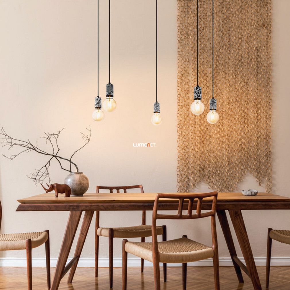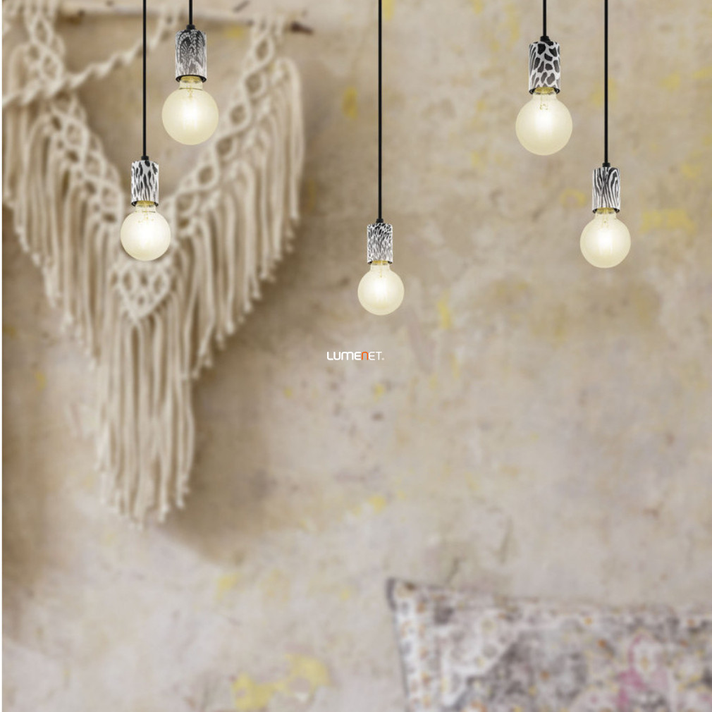 A Coulsdon Eglo 43314 zsinóros csillár egy vintage stílusú, fekete-fehér állatmintás függesztett lámpa, amely ötvözi az acél és műanyag anyaghasználatot. A lámpatest öt darab E27-es foglalattal rendelkezik, amelyekbe cserélhető fényforrás helyezhető el, így a fényáram, színhőmérséklet és teljesítmény szabadon választható. A csillár magassága 1310 mm, átmérője 145 mm, védettségi besorolása IP20, így beltéri használatra alkalmas. A termék nem tartalmaz fényforrást, szabályozhatóságot nem kínál. A csomagolás méretei: 15x15x12 cm, a termék tömege 1,15 kg. A Coulsdon Eglo 43314 gyártója az EGLO.