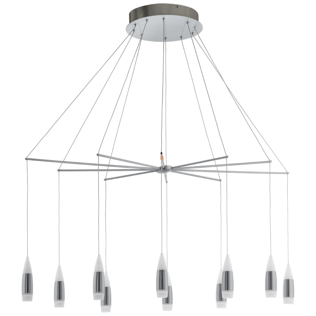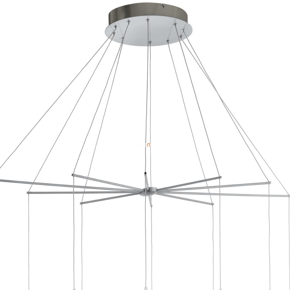 A Zsinóros LED csillár, csillag pálcás - Santiga Eglo 39327 egy modern függesztett lámpatest, amely 20 darab, egyenként 3,2 W teljesítményű LED modullal van felszerelve, így összesen 64 W névleges teljesítményt biztosít. A lámpatest fényárama eléri a 7800 lument, melegfehér, 3000 K színhőmérséklettel, amely ideális hangulatvilágítást teremt lakóterekben. A csillár szabályozható, így a fényerő igény szerint állítható. Anyaga acél, műanyag és alumínium, színe nikkel és fehér. A termék 1350 mm hosszú, 415 mm széles és 1100 mm magas, IP20 védettséggel rendelkezik, amely beltéri használatra alkalmas. A LED modulok beépítettek, így a fényforrásokat nem szükséges külön beszerezni. A gyártó az EGLO.